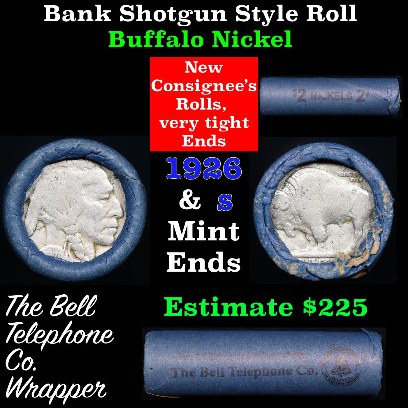 Buffalo Nickel Shotgun Roll in Old Bank Style 'Bell Telephone' Wrapper 1926 & S Mint Ends. The roll is held in an old, rare "Bell Telephone Co." Bank style wrapper. This is the Bell Telephone logo from the 1960's. They are all frrom one Estate. The ends on these rolls are very tight. We will guarantee they are all full dates.
