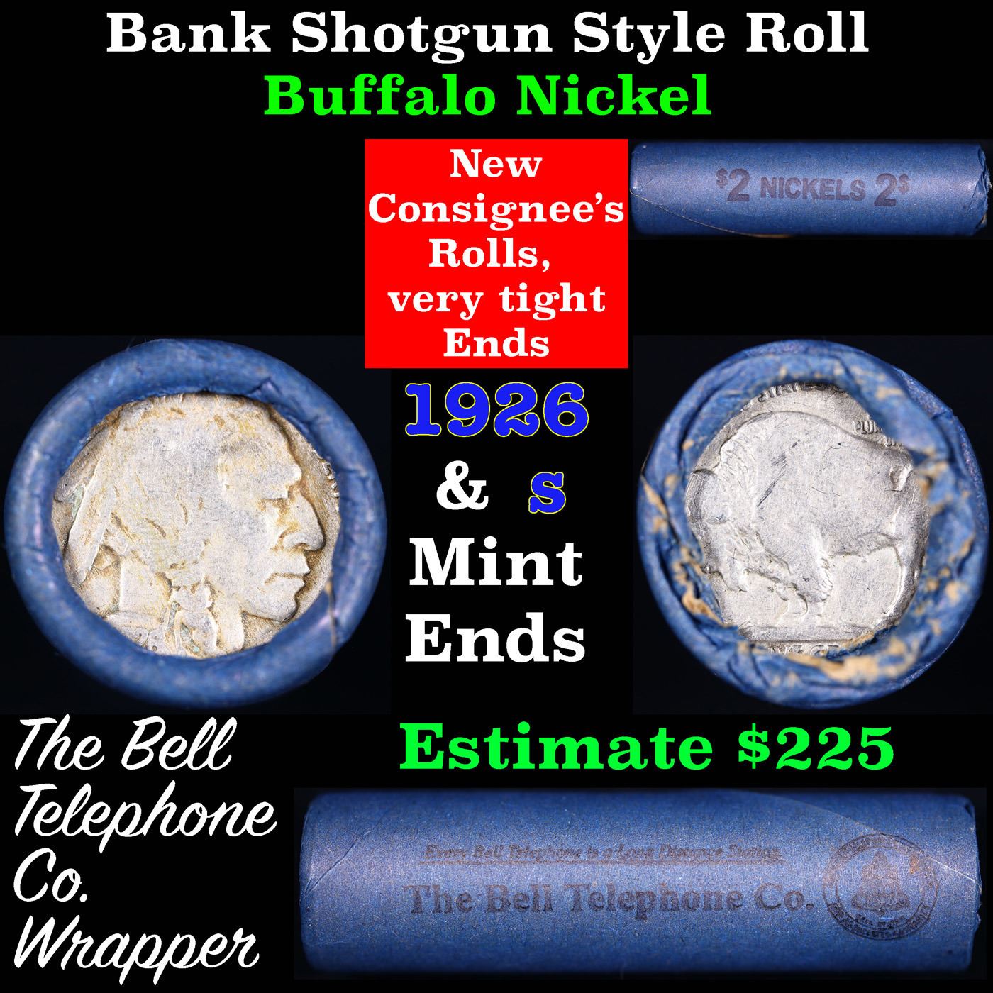 Buffalo Nickel Shotgun Roll in Old Bank Style 'Bell Telephone' Wrapper 1926 & S Mint Ends. The roll is held in an old, rare "Bell Telephone Co." Bank style wrapper. This is the Bell Telephone logo from the 1960's. They are all frrom one Estate. The ends on these rolls are very tight. We will guarantee they are all full dates.