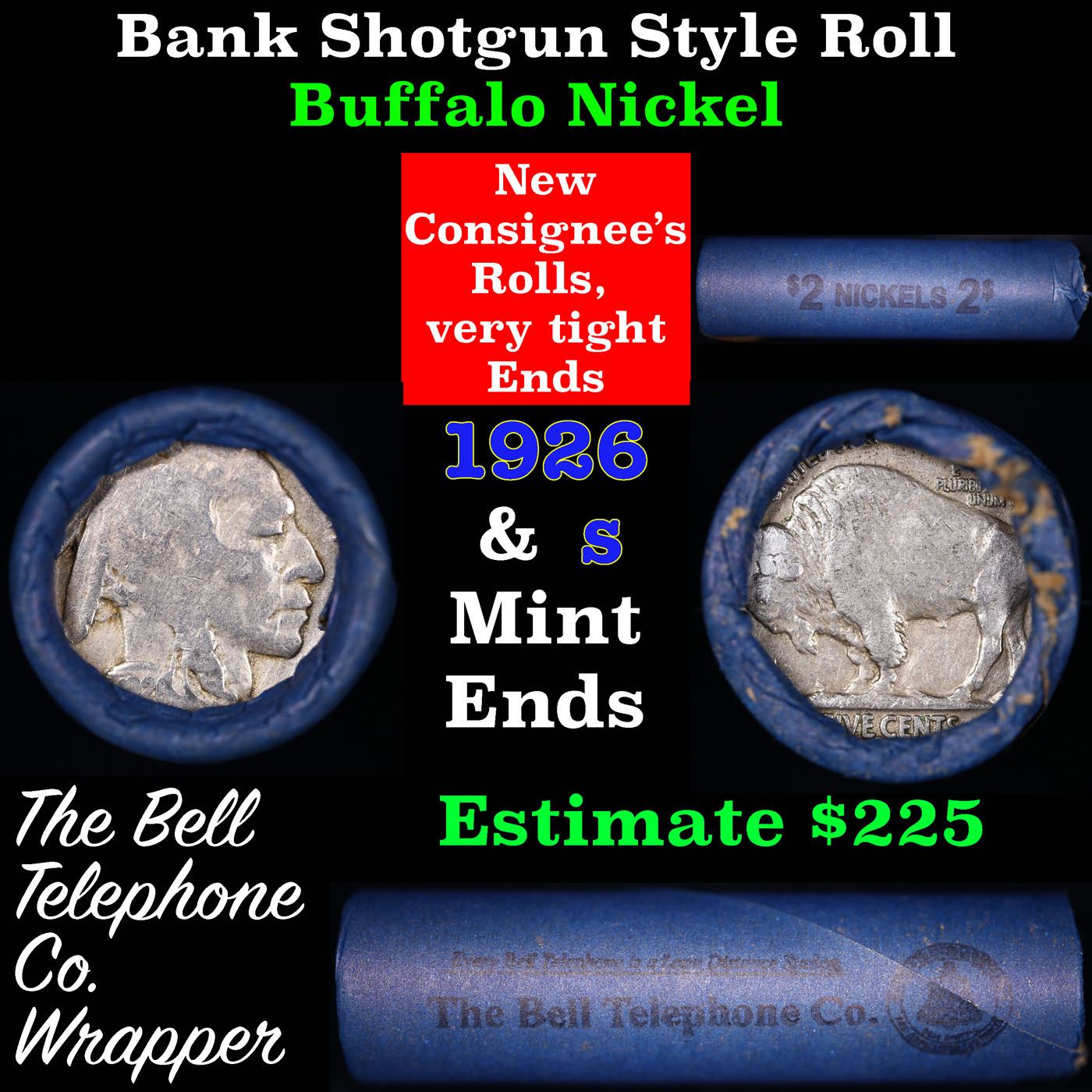 Buffalo Nickel Shotgun Roll in Old Bank Style 'Bell Telephone' Wrapper 1926 & S Mint Ends. The roll is held in an old, rare "Bell Telephone Co." Bank style wrapper. This is the Bell Telephone logo from the 1960's. They are all frrom one Estate. The ends on these rolls are very tight. We will guarantee they are all full dates.