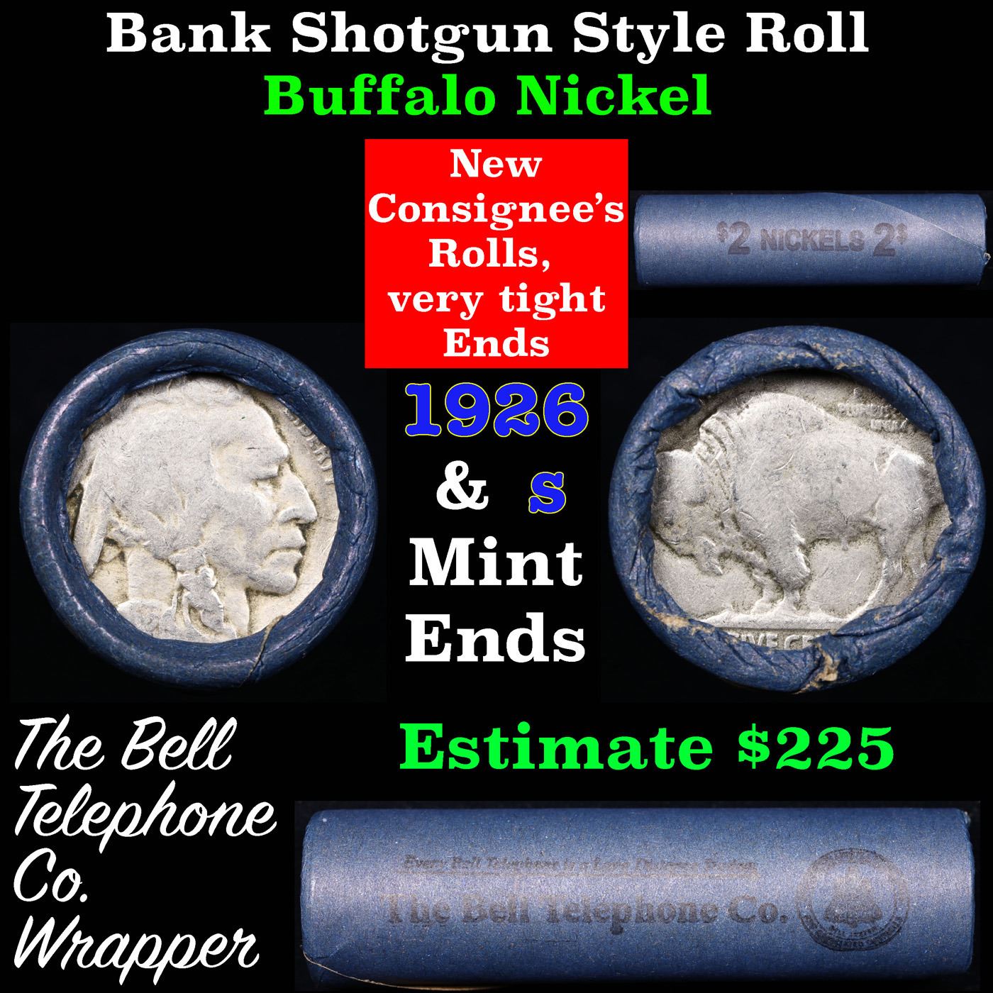 Buffalo Nickel Shotgun Roll in Old Bank Style 'Bell Telephone' Wrapper 1926 & S Mint Ends. The roll is held in an old, rare "Bell Telephone Co." Bank style wrapper. This is the Bell Telephone logo from the 1960's. They are all frrom one Estate. The ends on these rolls are very tight. We will guarantee they are all full dates.