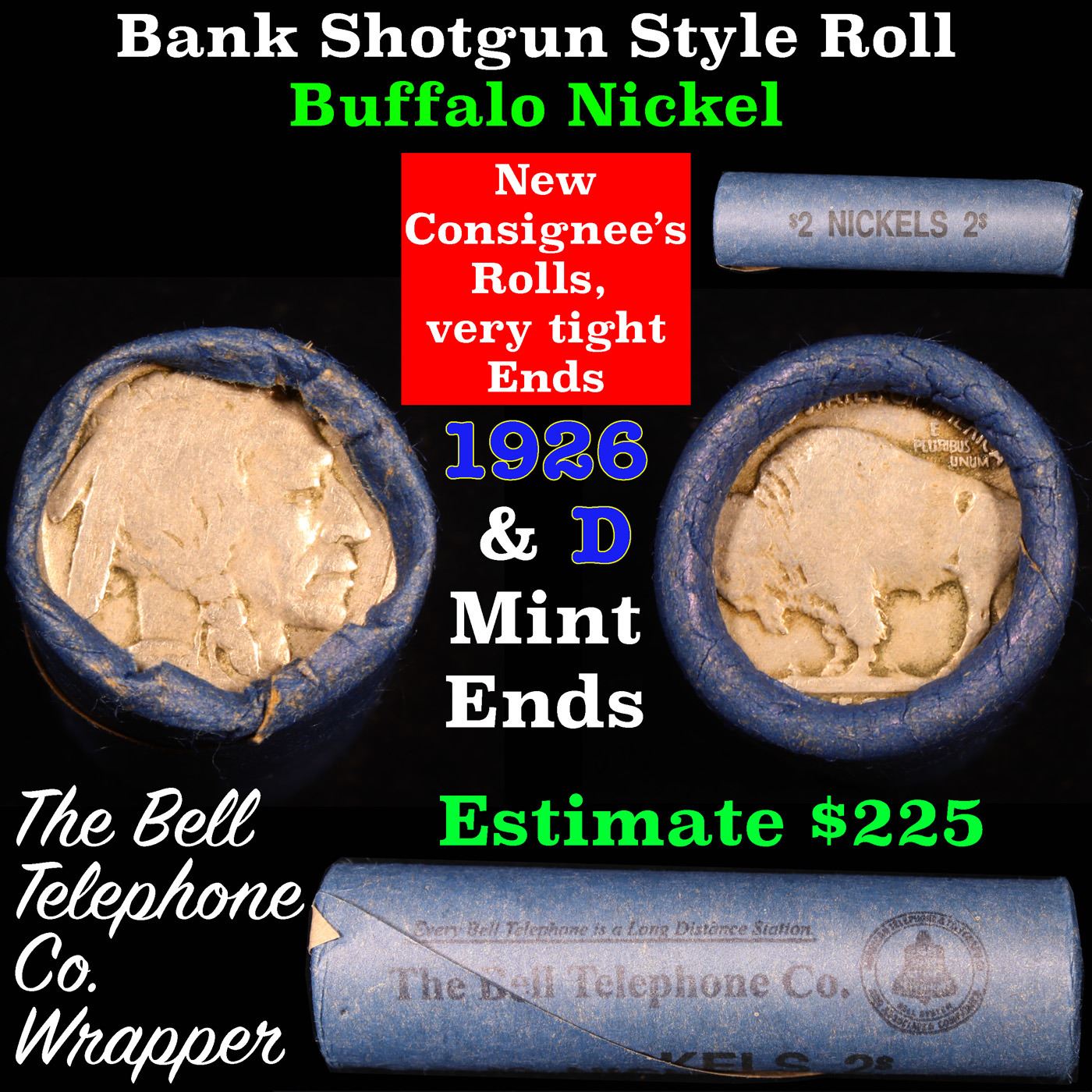 Buffalo Nickel Shotgun Roll in Old Bank Style 'Bell Telephone' Wrapper 1926 & d Mint Ends Grades. The roll is held in an old, rare "Bell Telephone" wrapper. Every Bell Telephone is a Long Distance station. They are all frrom one Estate. The ends on these rolls are very tight. We will guarantee they are all full dates.
