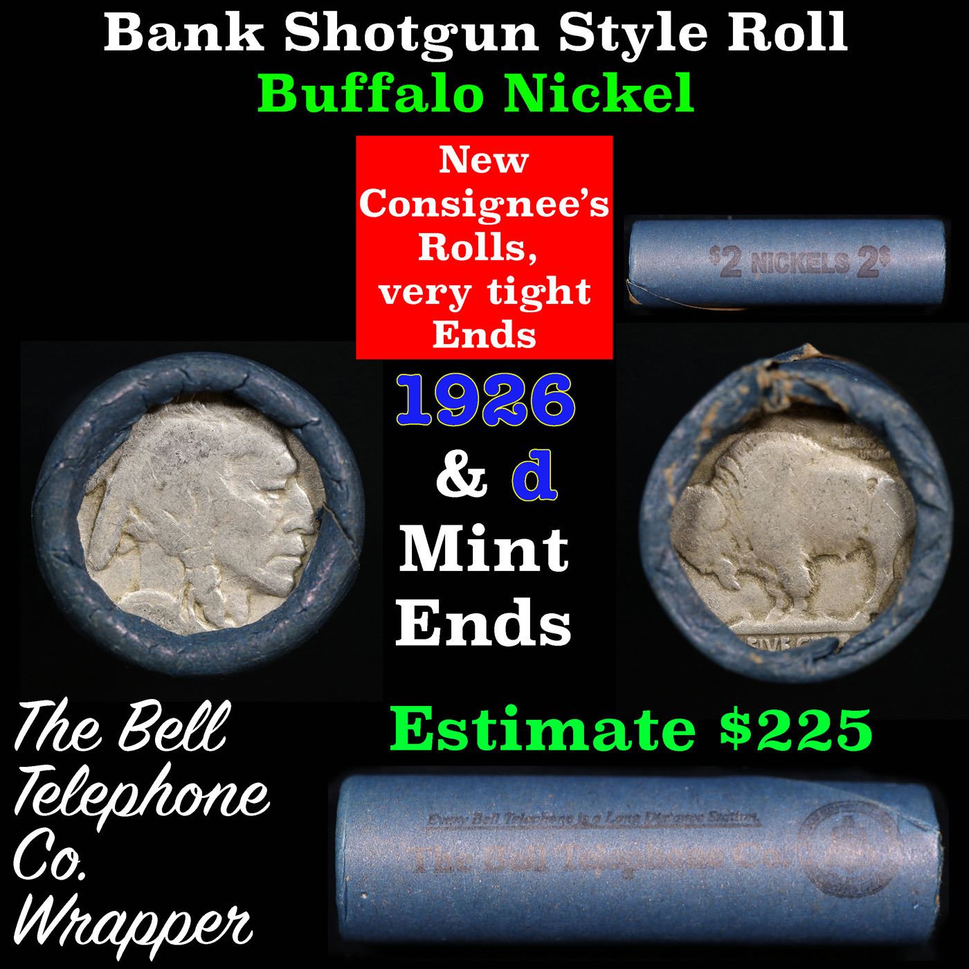 Buffalo Nickel Shotgun Roll in Old Bank Style 'Bell Telephone' Wrapper 1926 &d Mint Ends Grades. The roll is held in an old, rare "Bell Telephone Co." Bank style wrapper. This is the Bell Telephone logo from the 1960's. They are all frrom one Estate. The ends on these rolls are very tight. We will guarantee they are all full dates.