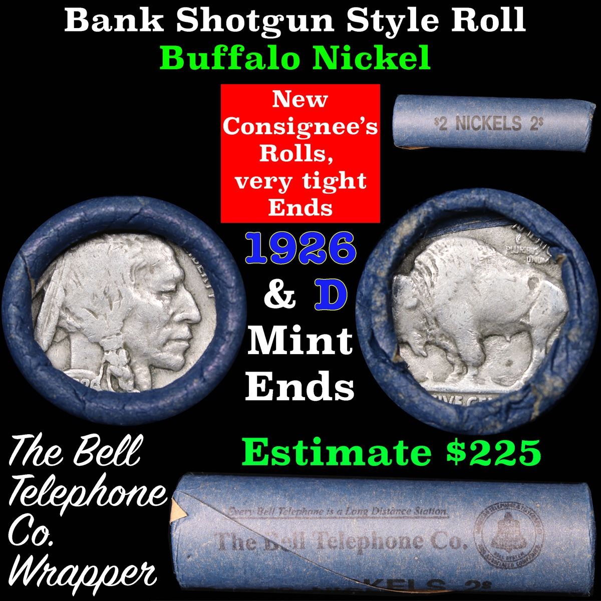 Buffalo Nickel Shotgun Roll in Old Bank Style 'Bell Telephone' Wrapper 1926 & d Mint Ends . .. The roll is held in an old, rare "Bell Telephone Co." Bank style wrapper. This is the Bell Telephone logo from the 1960's. They are all frrom one Estate. The ends on these rolls are very tight. We will guarantee they are all full dates.