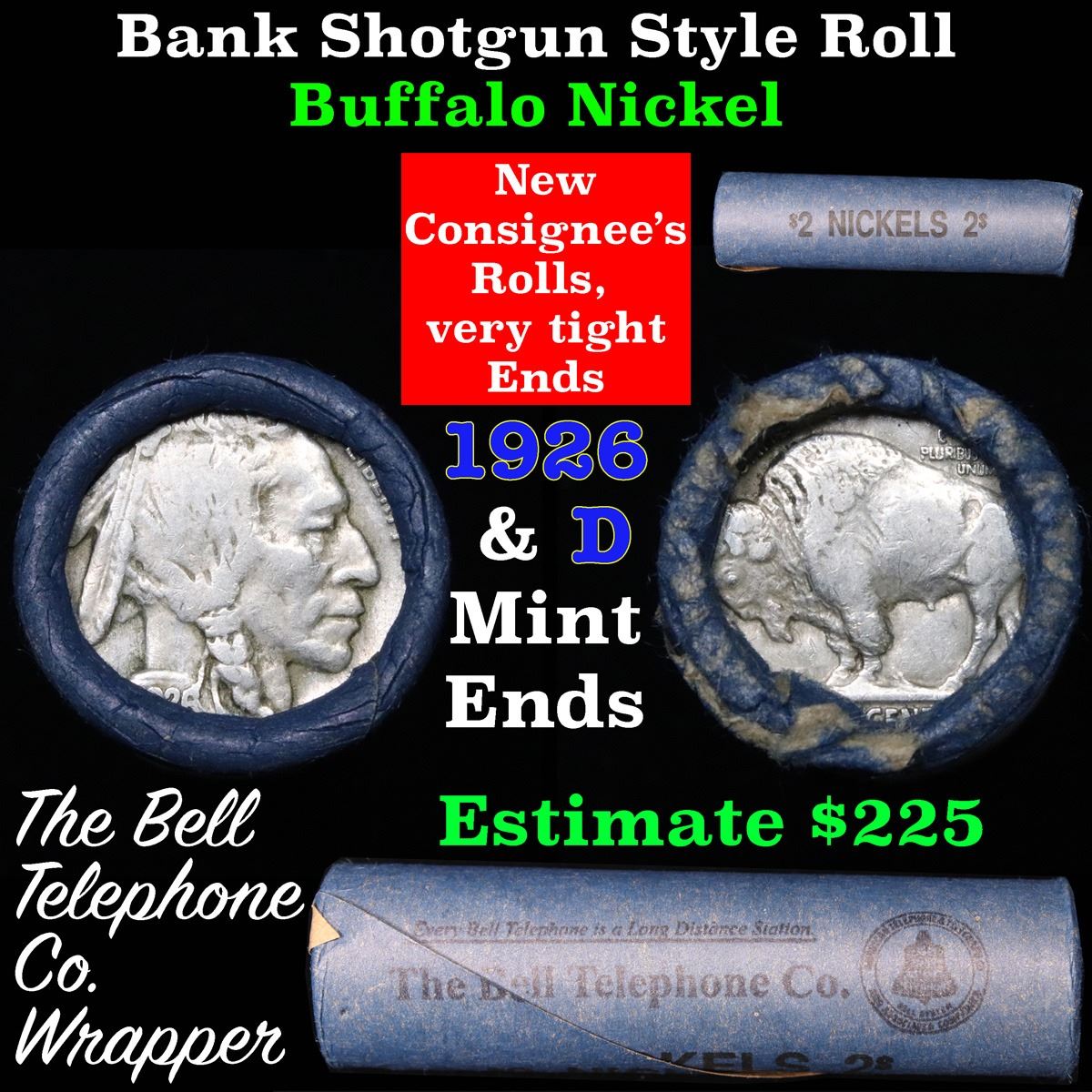 Buffalo Nickel Shotgun Roll in Old Bank Style 'Bell Telephone' Wrapper 1926 & d Mint Ends . .. The roll is held in an old, rare "Bell Telephone Co." Bank style wrapper. This is the Bell Telephone logo from the 1960's. They are all frrom one Estate. The ends on these rolls are very tight. We will guarantee they are all full dates.