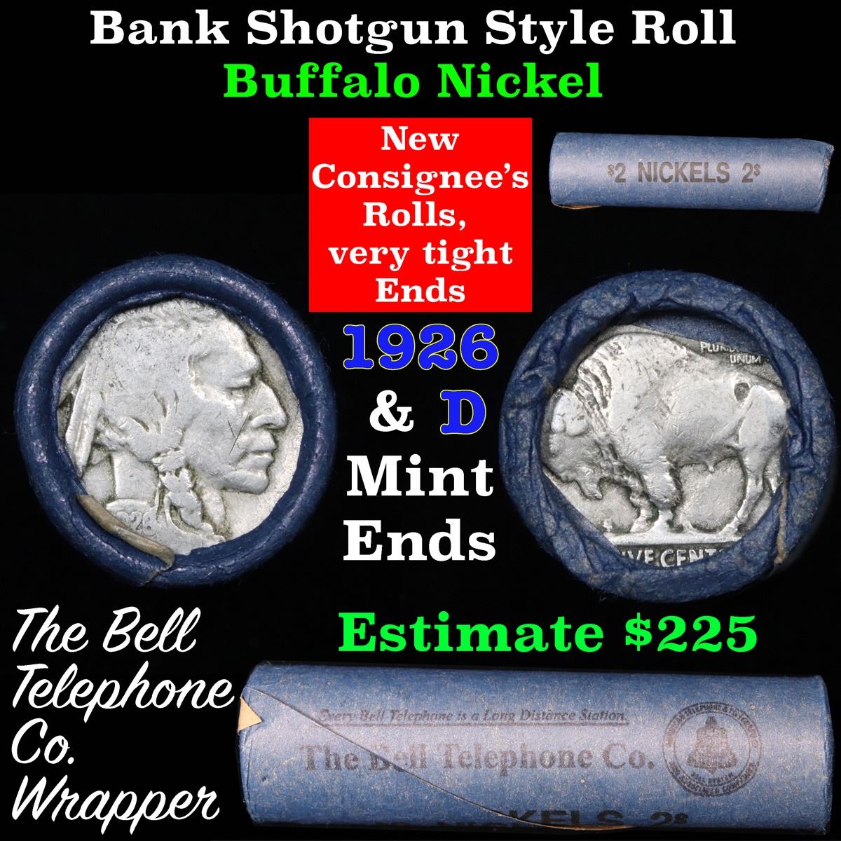 Buffalo Nickel Shotgun Roll in Old Bank Style 'Bell Telephone' Wrapper 1926 & d Mint Ends. The roll is held in an old, rare "Bell Telephone Co." Bank style wrapper. This is the Bell Telephone logo from the 1960's. They are all frrom one Estate. The ends on these rolls are very tight. We will guarantee they are all full dates.
