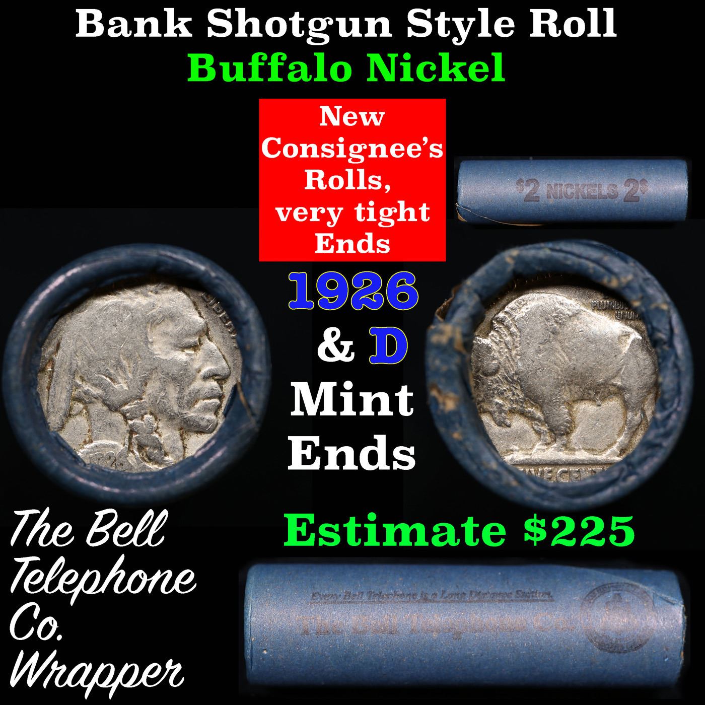 Buffalo Nickel Shotgun Roll in Old Bank Style 'Bell Telephone' Wrapper 1926 &d Mint Ends. The roll is held in an old, rare "Bell Telephone Co." Bank style wrapper. This is the Bell Telephone logo from the 1960's. They are all frrom one Estate. The ends on these rolls are very tight. We will guarantee they are all full dates.