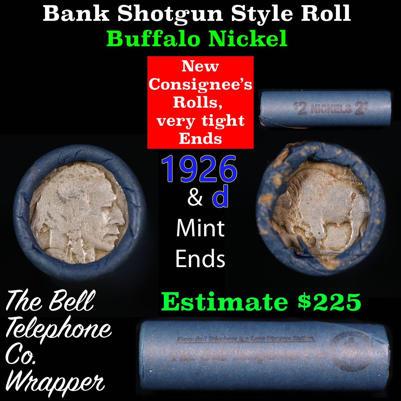 Buffalo Nickel Shotgun Roll in Old Bank Style 'Bell Telephone' Wrapper 1926 & d Mint Ends. The roll is held in an old, rare "Bell Telephone Co." Bank style wrapper. This is the Bell Telephone logo from the 1960's. They are all from one Estate. The ends on these rolls are very tight. We will guarantee they are all full dates.