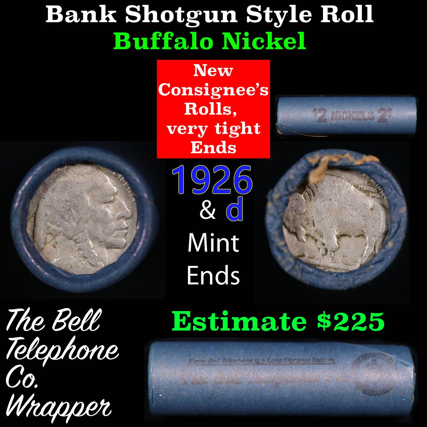 Buffalo Nickel Shotgun Roll in Old Bank Style 'Bell Telephone' Wrapper 1926 & d Mint Ends. The roll is held in an old, rare "Bell Telephone Co." Bank style wrapper. This is the Bell Telephone logo from the 1960's. They are all from one Estate. The ends on these rolls are very tight. We will guarantee they are all full dates.