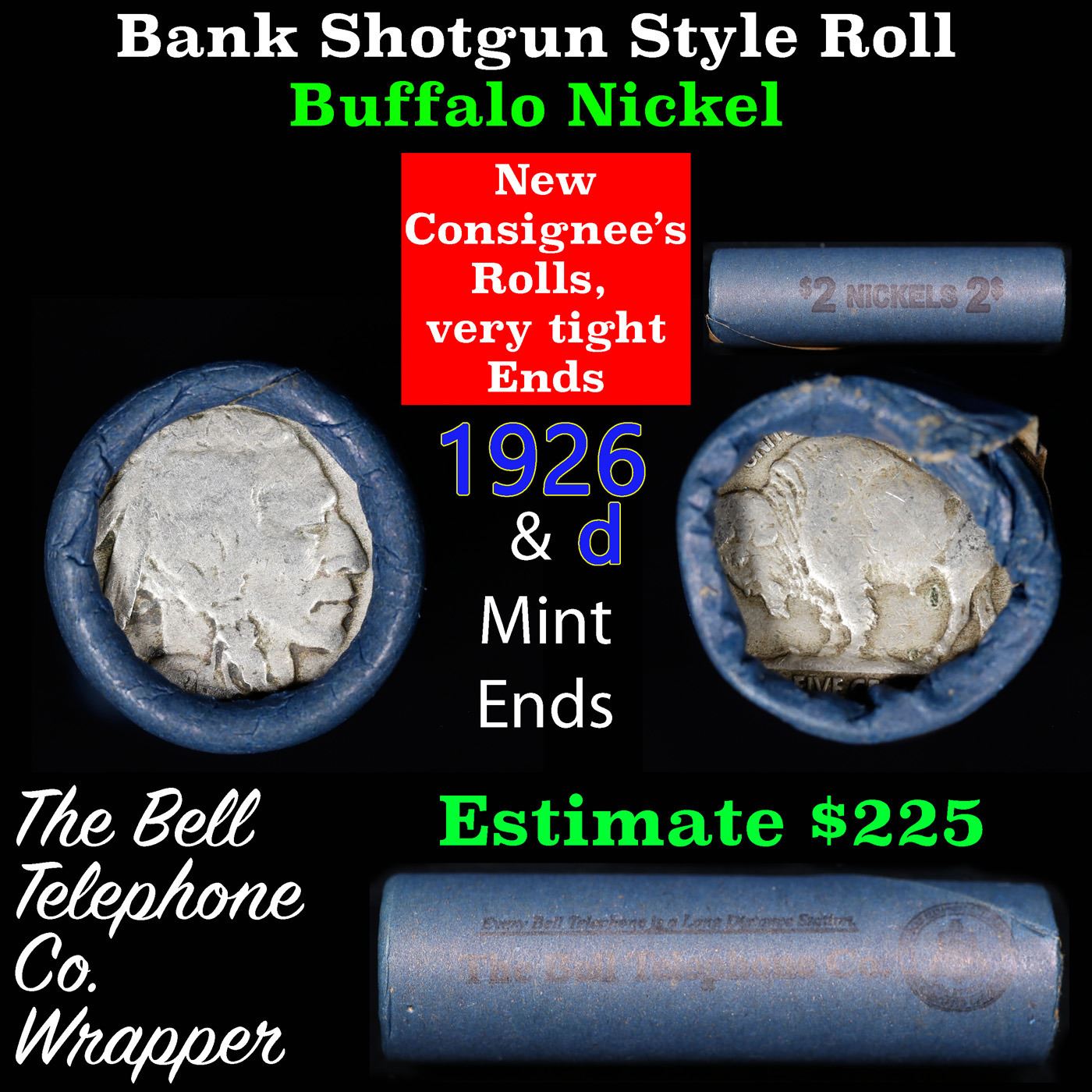 Buffalo Nickel Shotgun Roll in Old Bank Style 'Bell Telephone' Wrapper 1926 &d Mint Ends. The roll is held in an old, rare "Bell Telephone Co." Bank style wrapper. This is the Bell Telephone logo from the 1960's. They are all frrom one Estate. The ends on these rolls are very tight. We will guarantee they are all full dates.