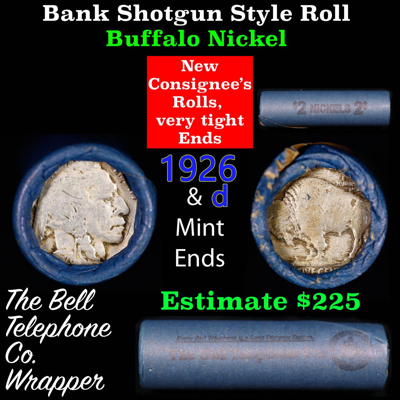 Buffalo Nickel Shotgun Roll in Old Bank Style 'Bell Telephone' Wrapper 1926 &d Mint Ends. The roll is held in an old, rare "Bell Telephone Co." Bank style wrapper. This is the Bell Telephone logo from the 1960's. They are all frrom one Estate. The ends on these rolls are very tight. We will guarantee they are all full dates.