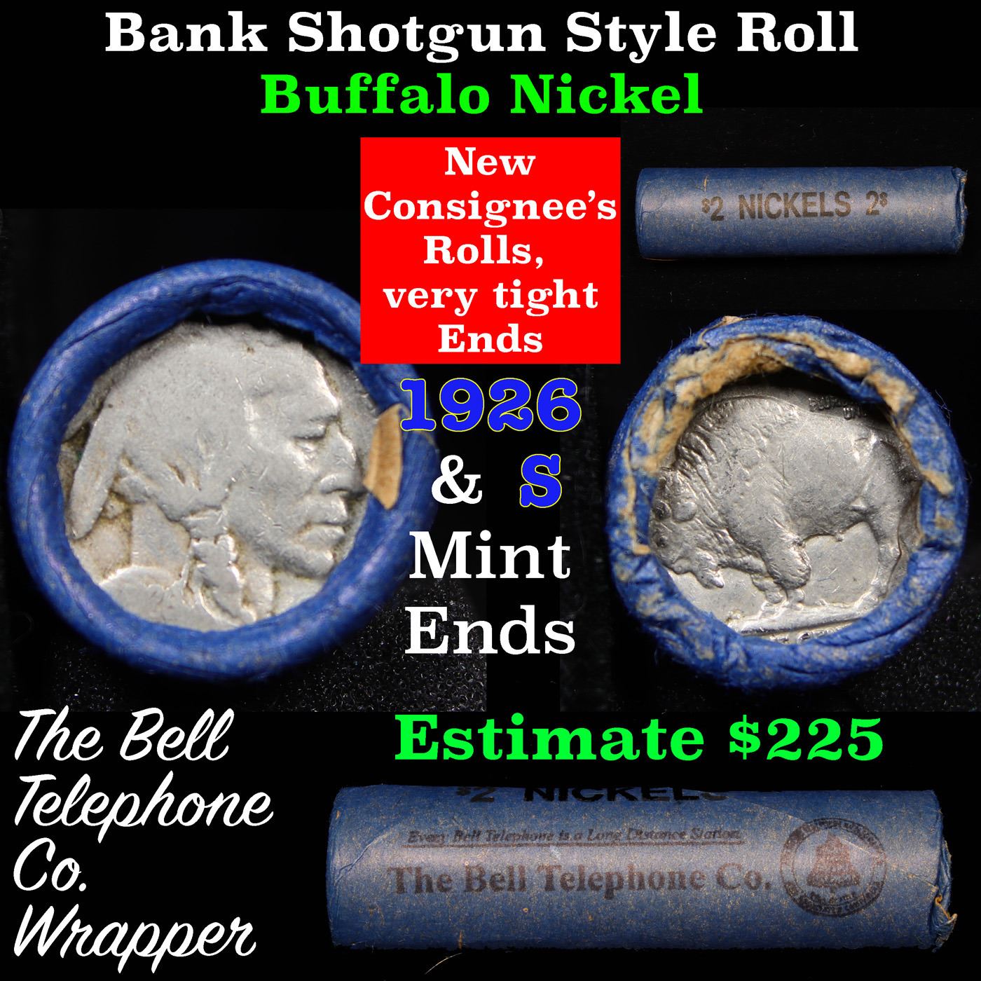 Buffalo Nickel Shotgun Roll in Old Bank Style 'Bell Telephone' Wrapper 1926 & s Mint Ends Grades. The roll is held in an old, rare "Bell Telephone Co." Bank style wrapper. This is the Bell Telephone logo from the 1960's. They are all frrom one Estate. The ends on these rolls are very tight. We will guarantee they are all full dates.