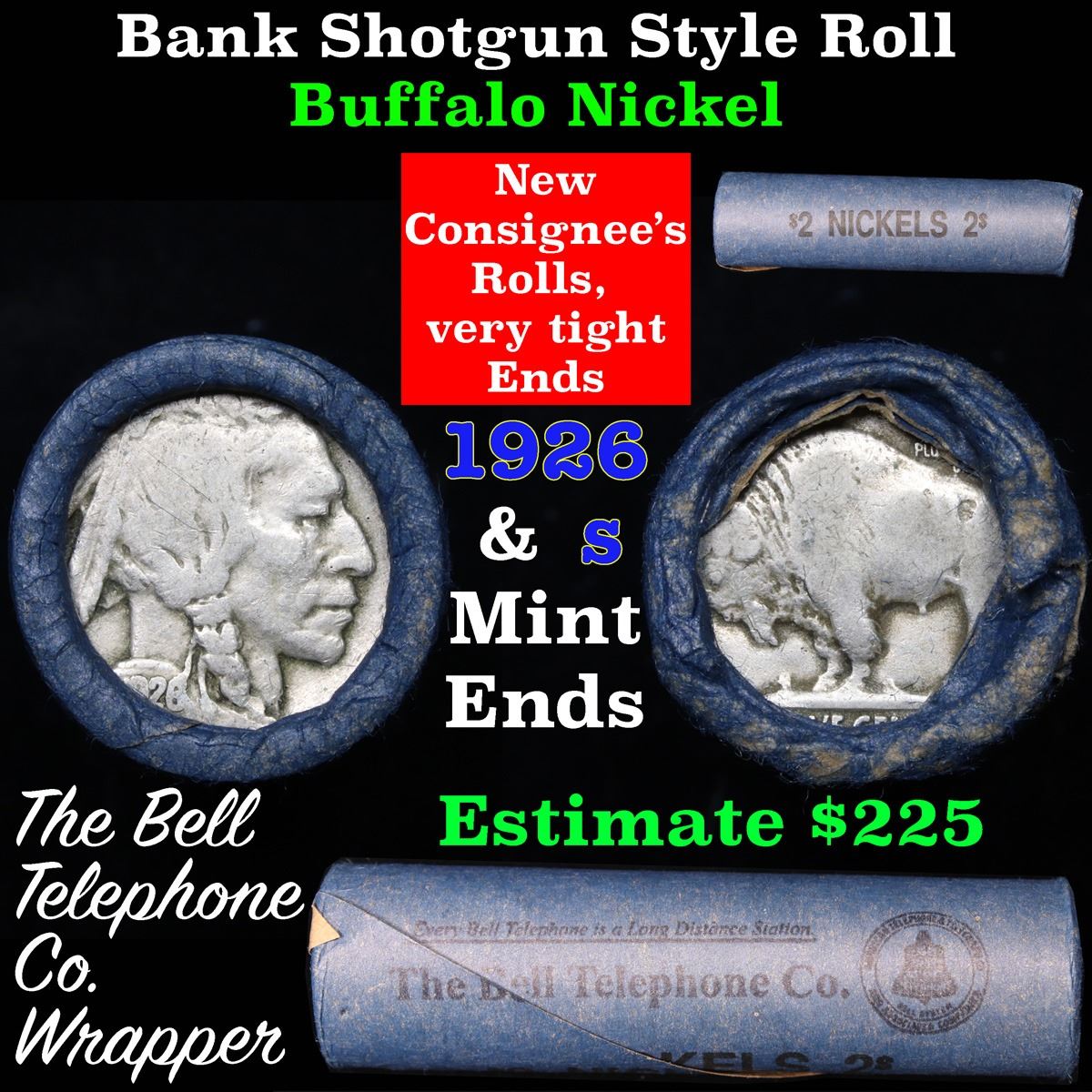 Buffalo Nickel Shotgun Roll in Old Bank Style 'Bell Telephone' Wrapper 1926& s Mint Ends. The roll is held in an old, rare "Bell Telephone Co." Bank style wrapper. This is the Bell Telephone logo from the 1960's. They are all frrom one Estate. The ends on these rolls are very tight. We will guarantee they are all full dates.