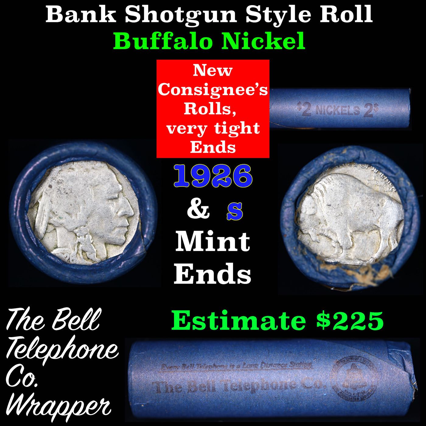 Buffalo Nickel Shotgun Roll in Old Bank Style 'Bell Telephone' Wrapper 1926 & s Mint Ends. The roll is held in an old, rare "Bell Telephone Co." Bank style wrapper. This is the Bell Telephone logo from the 1960's. They are all frrom one Estate. The ends on these rolls are very tight. We will guarantee they are all full dates.