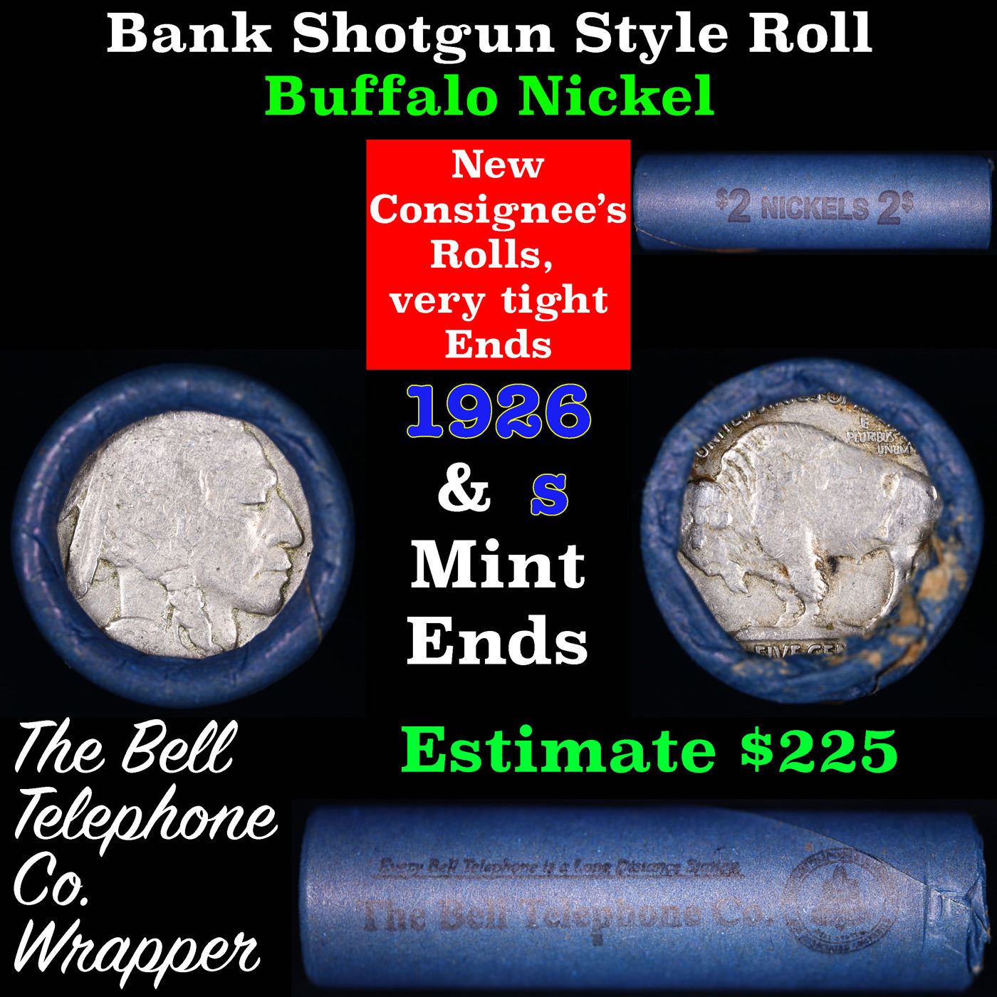 Buffalo Nickel Shotgun Roll in Old Bank Style 'Bell Telephone' Wrapper 1926 &s Mint Ends. The roll is held in an old, rare "Bell Telephone Co." Bank style wrapper. This is the Bell Telephone logo from the 1960's. They are all frrom one Estate. The ends on these rolls are very tight. We will guarantee they are all full dates.
