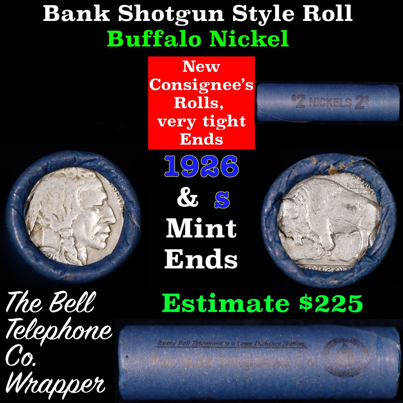 Buffalo Nickel Shotgun Roll in Old Bank Style 'Bell Telephone' Wrapper 1926 &s Mint Ends. The roll is held in an old, rare "Bell Telephone Co." Bank style wrapper. This is the Bell Telephone logo from the 1960's. They are all frrom one Estate. The ends on these rolls are very tight. We will guarantee they are all full dates.