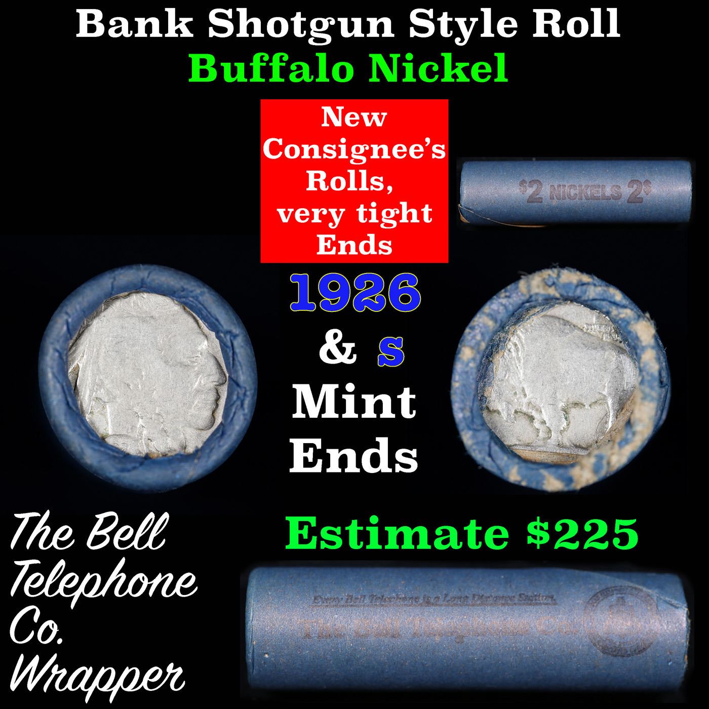 Buffalo Nickel Shotgun Roll in Old Bank Style 'Bell Telephone' Wrapper 1926 & s Mint Ends. The roll is held in an old, rare "Bell Telephone Co." Bank style wrapper. This is the Bell Telephone logo from the 1960's. They are all frrom one Estate. The ends on these rolls are very tight. We will guarantee they are all full dates.