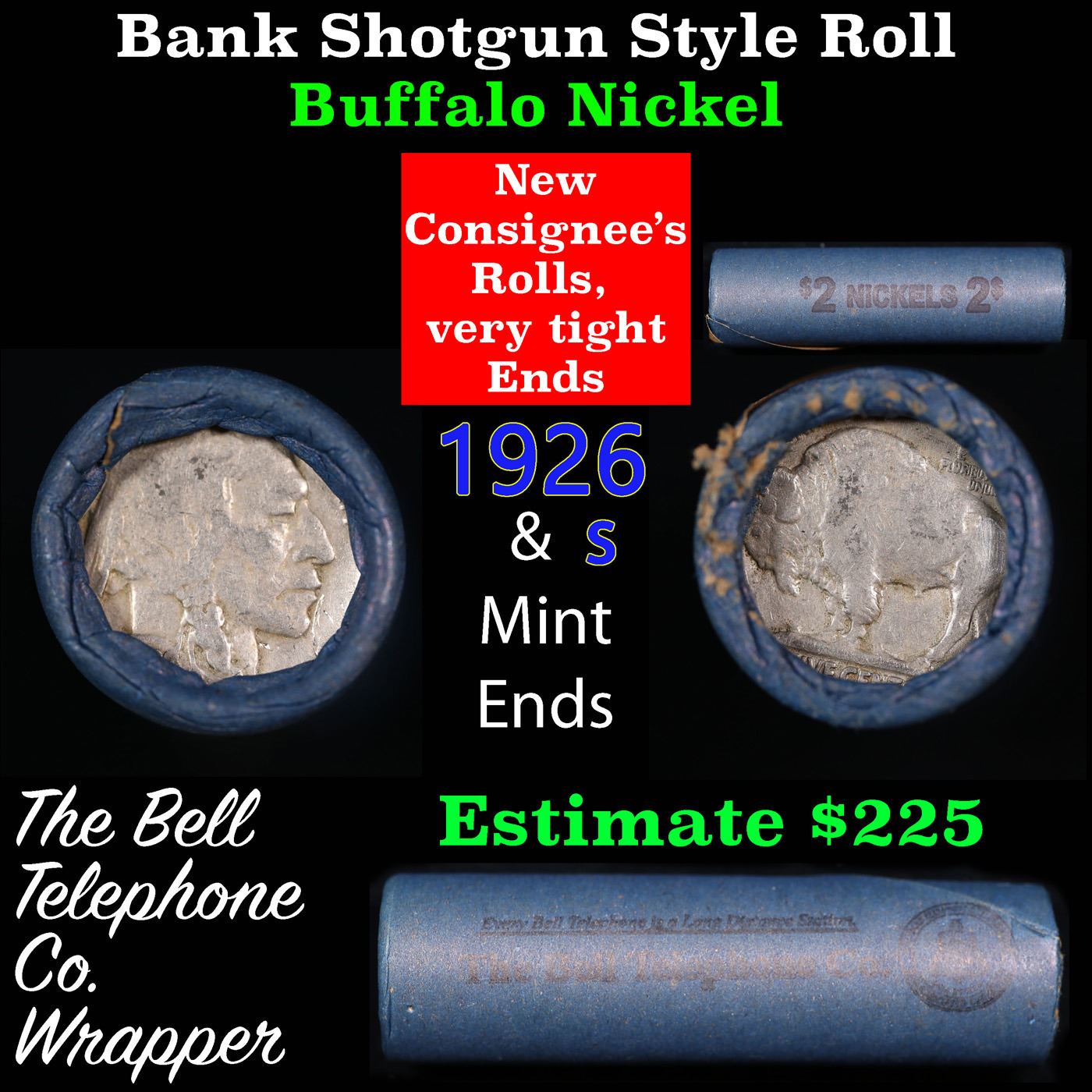 Buffalo Nickel Shotgun Roll in Old Bank Style 'Bell Telephone' Wrapper 1926 & s Mint Ends. The roll is held in an old, rare "Bell Telephone Co." Bank style wrapper. This is the Bell Telephone logo from the 1960's. They are all from one Estate. The ends on these rolls are very tight. We will guarantee they are all full dates.