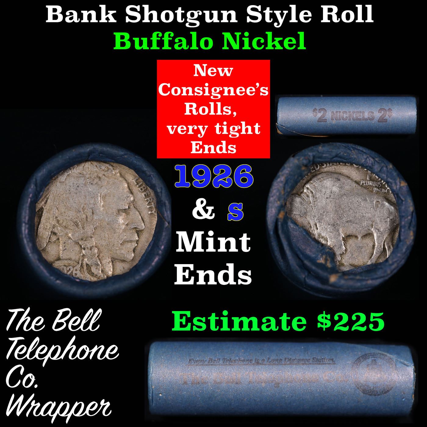 Buffalo Nickel Shotgun Roll in Old Bank Style 'Bell Telephone' Wrapper 1926 & s Mint Ends. The roll is held in an old, rare "Bell Telephone Co." Bank style wrapper. This is the Bell Telephone logo from the 1960's. They are all frrom one Estate. The ends on these rolls are very tight. We will guarantee they are all full dates.