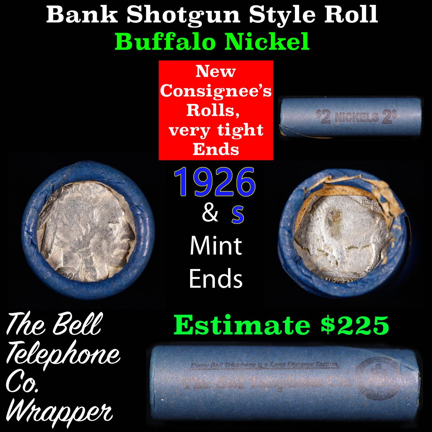 Buffalo Nickel Shotgun Roll in Old Bank Style 'Bell Telephone' Wrapper 1926 &s Mint Ends. The roll is held in an old, rare "Bell Telephone Co." Bank style wrapper. This is the Bell Telephone logo from the 1960's. They are all frrom one Estate. The ends on these rolls are very tight. We will guarantee they are all full dates.