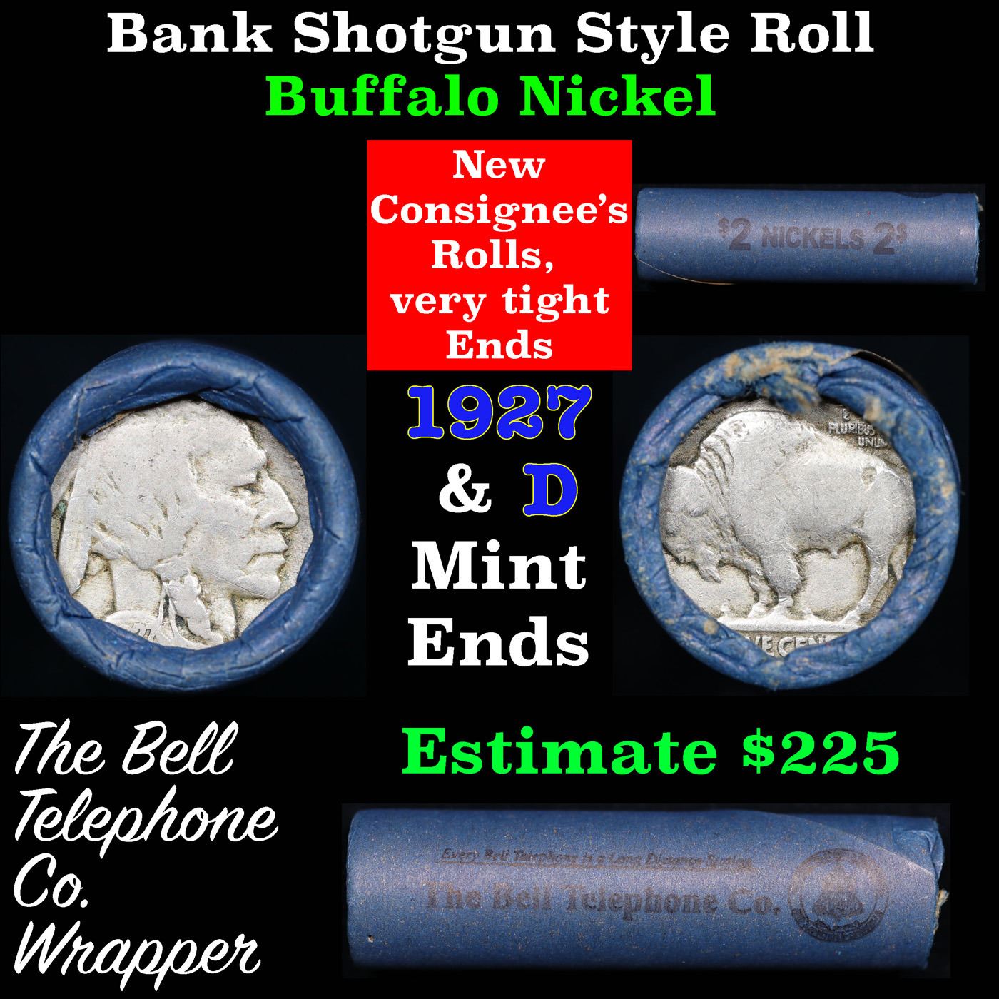 Buffalo Nickel Shotgun Roll in Old Bank Style 'Bell Telephone' Wrapper 1927 & D Mint Ends. The roll is held in an old, rare "Bell Telephone Co." Bank style wrapper. This is the Bell Telephone logo from the 1960's. They are all frrom one Estate. The ends on these rolls are very tight. We will guarantee they are all full dates.