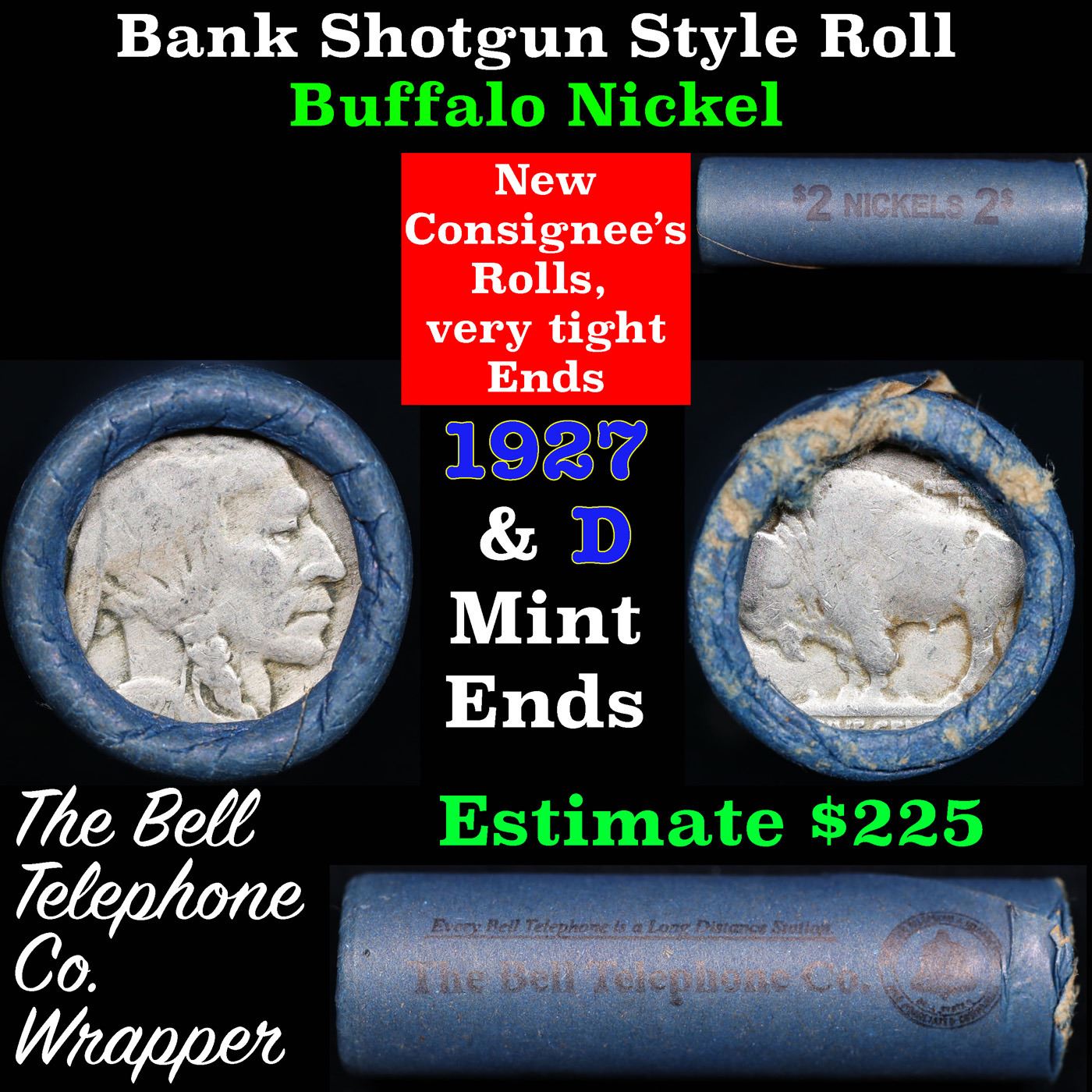 Buffalo Nickel Shotgun Roll in Old Bank Style 'Bell Telephone' Wrapper 1927 & D Mint Ends. The roll is held in an old, rare "Bell Telephone Co." Bank style wrapper. This is the Bell Telephone logo from the 1960's. They are all frrom one Estate. The ends on these rolls are very tight. We will guarantee they are all full dates.