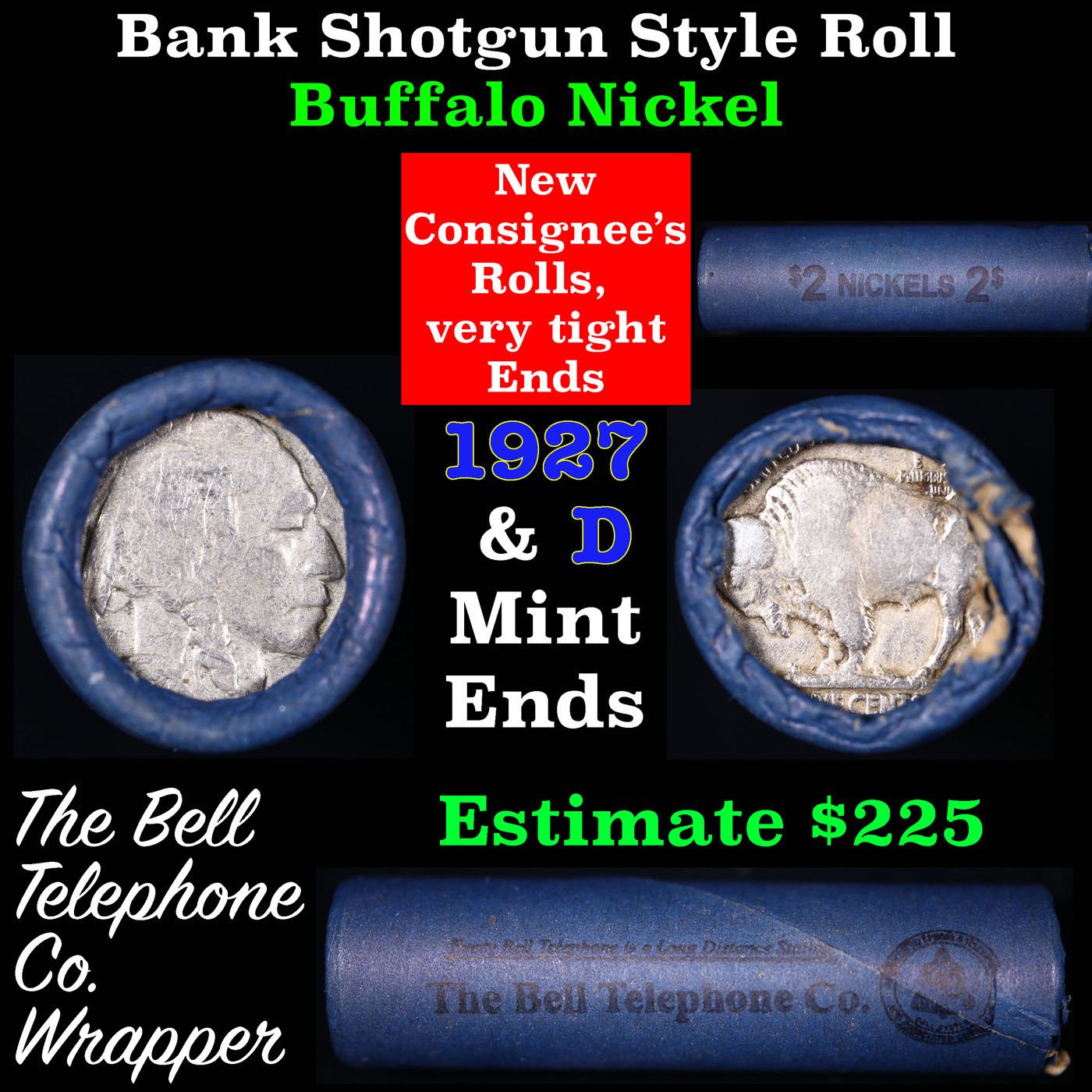 Buffalo Nickel Shotgun Roll in Old Bank Style 'Bell Telephone' Wrapper 1927 & D Mint Ends. The roll is held in an old, rare "Bell Telephone Co." Bank style wrapper. This is the Bell Telephone logo from the 1960's. They are all frrom one Estate. The ends on these rolls are very tight. We will guarantee they are all full dates.