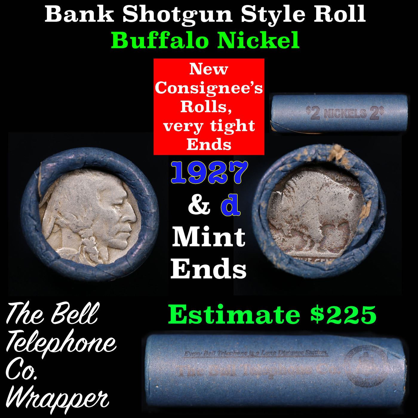 Buffalo Nickel Shotgun Roll in Old Bank Style 'Bell Telephone' Wrapper 1927 & D Mint Ends.. The roll is held in an old, rare "Bell Telephone Co." Bank style wrapper. This is the Bell Telephone logo from the 1960's. They are all frrom one Estate. The ends on these rolls are very tight. We will guarantee they are all full dates.
