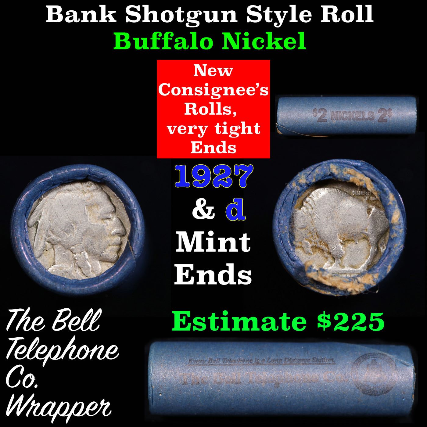 Buffalo Nickel Shotgun Roll in Old Bank Style 'Bell Telephone' Wrapper 1927 & D Mint Ends. The roll is held in an old, rare "Bell Telephone Co." Bank style wrapper. This is the Bell Telephone logo from the 1960's. They are all frrom one Estate. The ends on these rolls are very tight. We will guarantee they are all full dates.