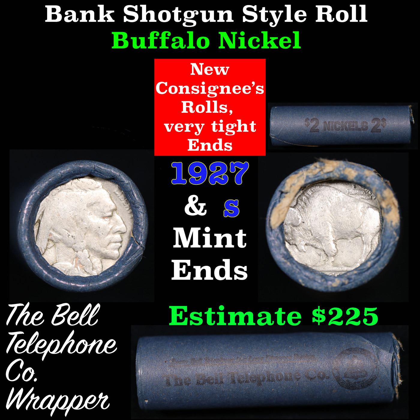 Buffalo Nickel Shotgun Roll in Old Bank Style 'Bell Telephone' Wrapper 1927 & S Mint Ends.. The roll is held in an old, rare "Bell Telephone Co." Bank style wrapper. This is the Bell Telephone logo from the 1960's. They are all frrom one Estate. The ends on these rolls are very tight. We will guarantee they are all full dates.