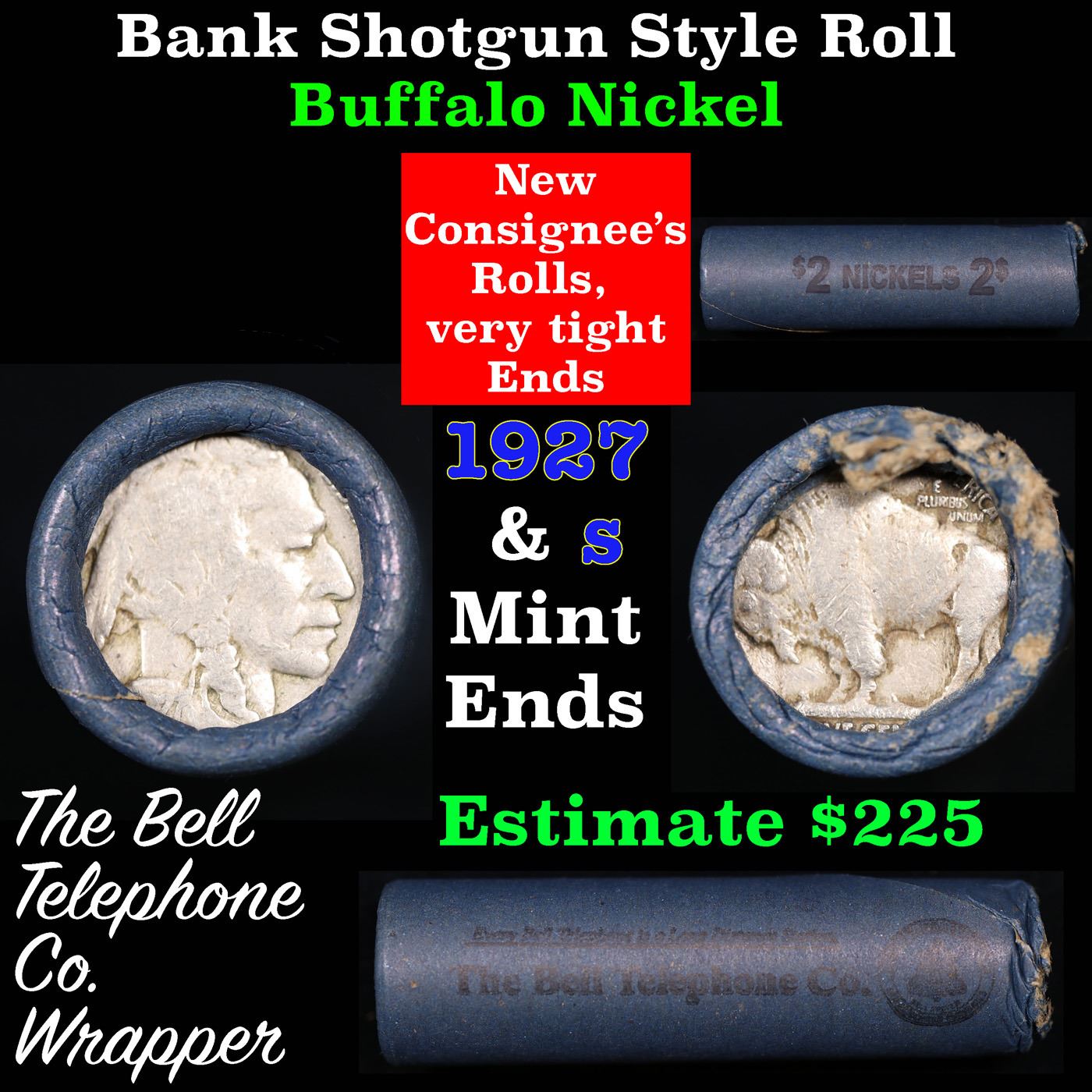 Buffalo Nickel Shotgun Roll in Old Bank Style 'Bell Telephone' Wrapper 1927 & S Mint Ends.. The roll is held in an old, rare "Bell Telephone Co." Bank style wrapper. This is the Bell Telephone logo from the 1960's. They are all frrom one Estate. The ends on these rolls are very tight. We will guarantee they are all full dates.