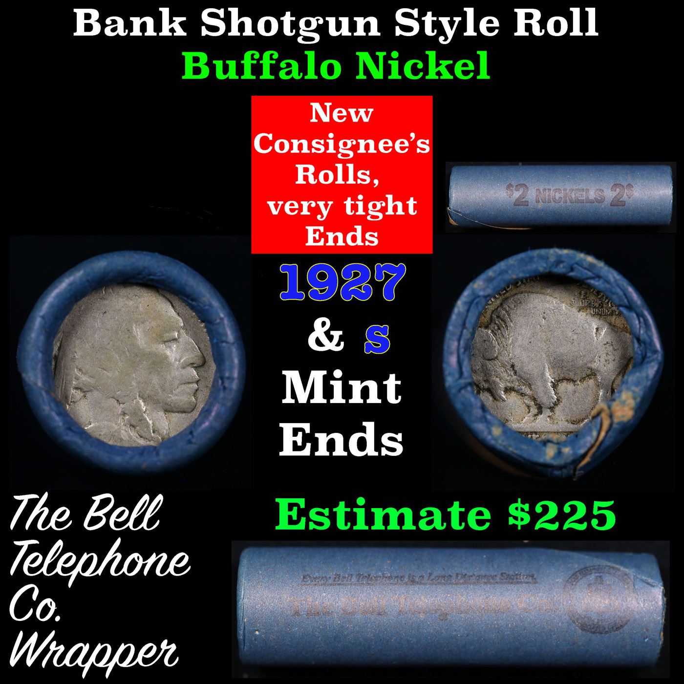 Buffalo Nickel Shotgun Roll in Old Bank Style 'Bell Telephone' Wrapper 1927 & S Mint Ends.. The roll is held in an old, rare "Bell Telephone Co." Bank style wrapper. This is the Bell Telephone logo from the 1960's. They are all frrom one Estate. The ends on these rolls are very tight. We will guarantee they are all full dates.