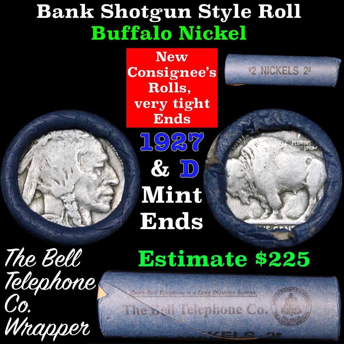 Buffalo Nickel Shotgun Roll in Old Bank Style 'Bell Telephone' Wrapper 1927 & d Mint Ends . .. The roll is held in an old, rare "Bell Telephone Co." Bank style wrapper. This is the Bell Telephone logo from the 1960's. They are all frrom one Estate. The ends on these rolls are very tight. We will guarantee they are all full dates.