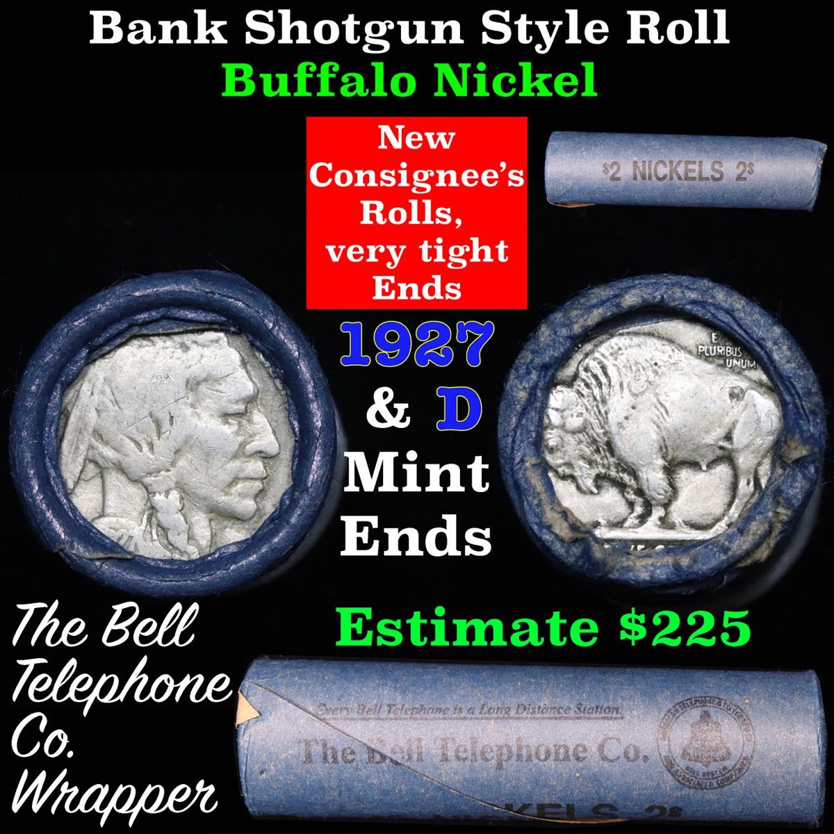 Buffalo Nickel Shotgun Roll in Old Bank Style 'Bell Telephone' Wrapper 1927 & d Mint Ends. The roll is held in an old, rare "Bell Telephone Co." Bank style wrapper. This is the Bell Telephone logo from the 1960's. They are all frrom one Estate. The ends on these rolls are very tight. We will guarantee they are all full dates.