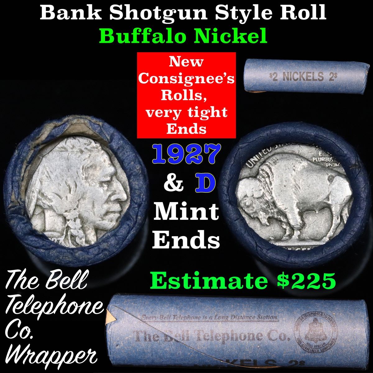 Buffalo Nickel Shotgun Roll in Old Bank Style 'Bell Telephone' Wrapper 1927 & d Mint Ends. The roll is held in an old, rare "Bell Telephone Co." Bank style wrapper. This is the Bell Telephone logo from the 1960's. They are all frrom one Estate. The ends on these rolls are very tight. We will guarantee they are all full dates.
