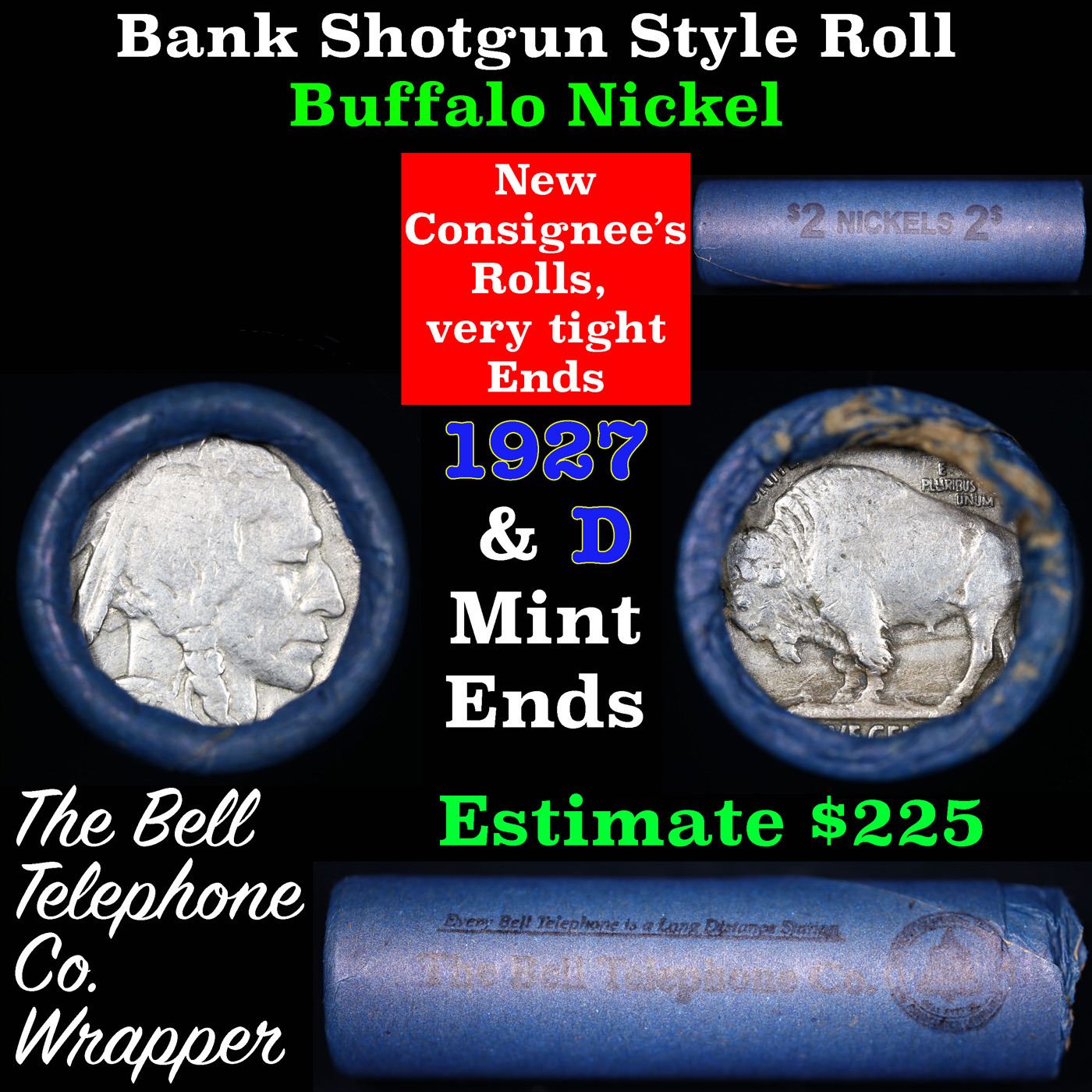 Buffalo Nickel Shotgun Roll in Old Bank Style 'Bell Telephone' Wrapper 1927 & d Mint Ends