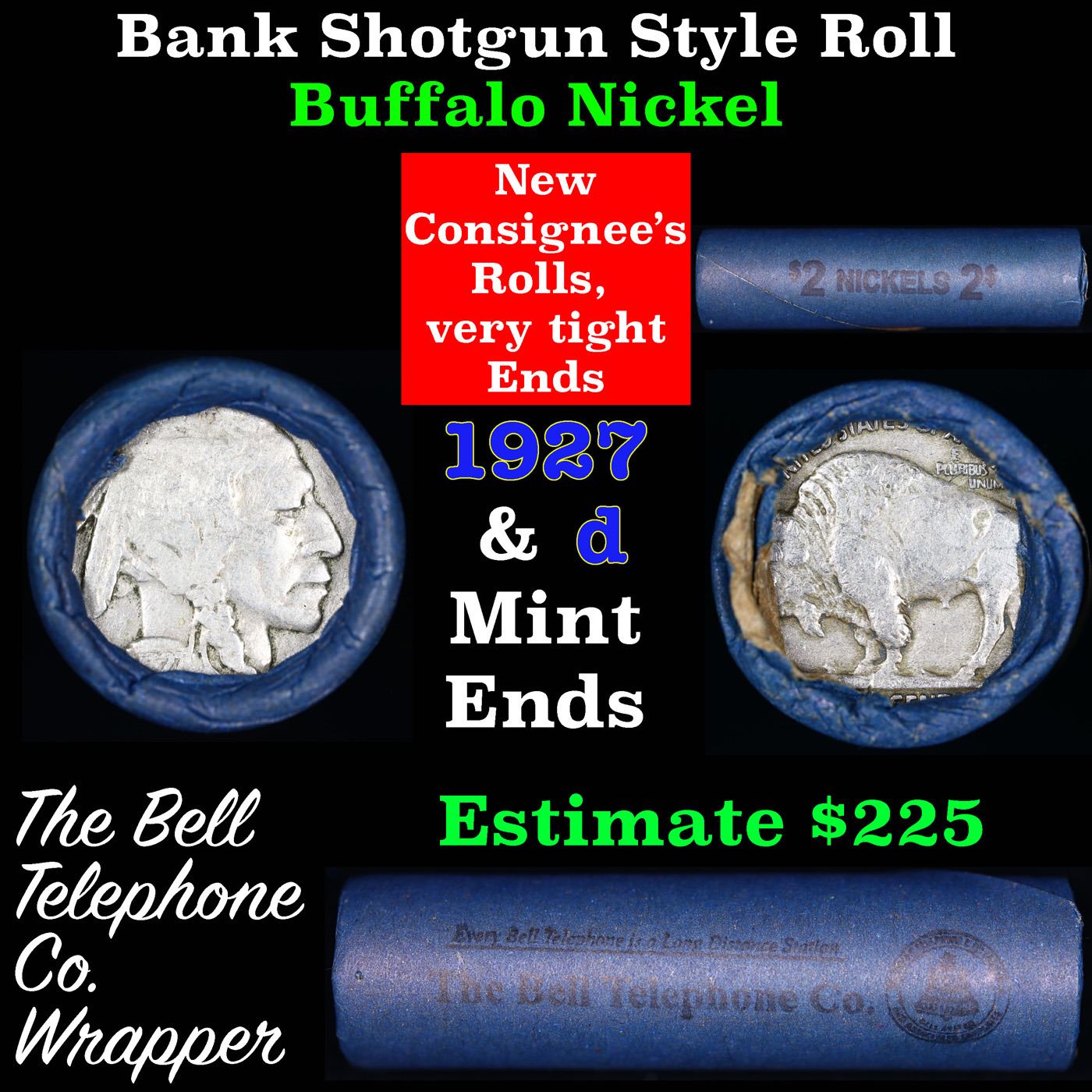 Buffalo Nickel Shotgun Roll in Old Bank Style 'Bell Telephone' Wrapper 1927 & d Mint Ends. The roll is held in an old, rare "Bell Telephone Co." Bank style wrapper. This is the Bell Telephone logo from the 1960's. They are all frrom one Estate. The ends on these rolls are very tight. We will guarantee they are all full dates.