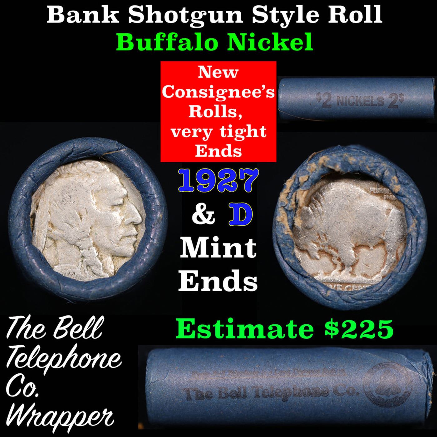 Buffalo Nickel Shotgun Roll in Old Bank Style 'Bell Telephone' Wrapper 1927 & d Mint Ends. The roll is held in an old, rare "Bell Telephone Co." Bank style wrapper. This is the Bell Telephone logo from the 1960's. They are all frrom one Estate. The ends on these rolls are very tight. We will guarantee they are all full dates.