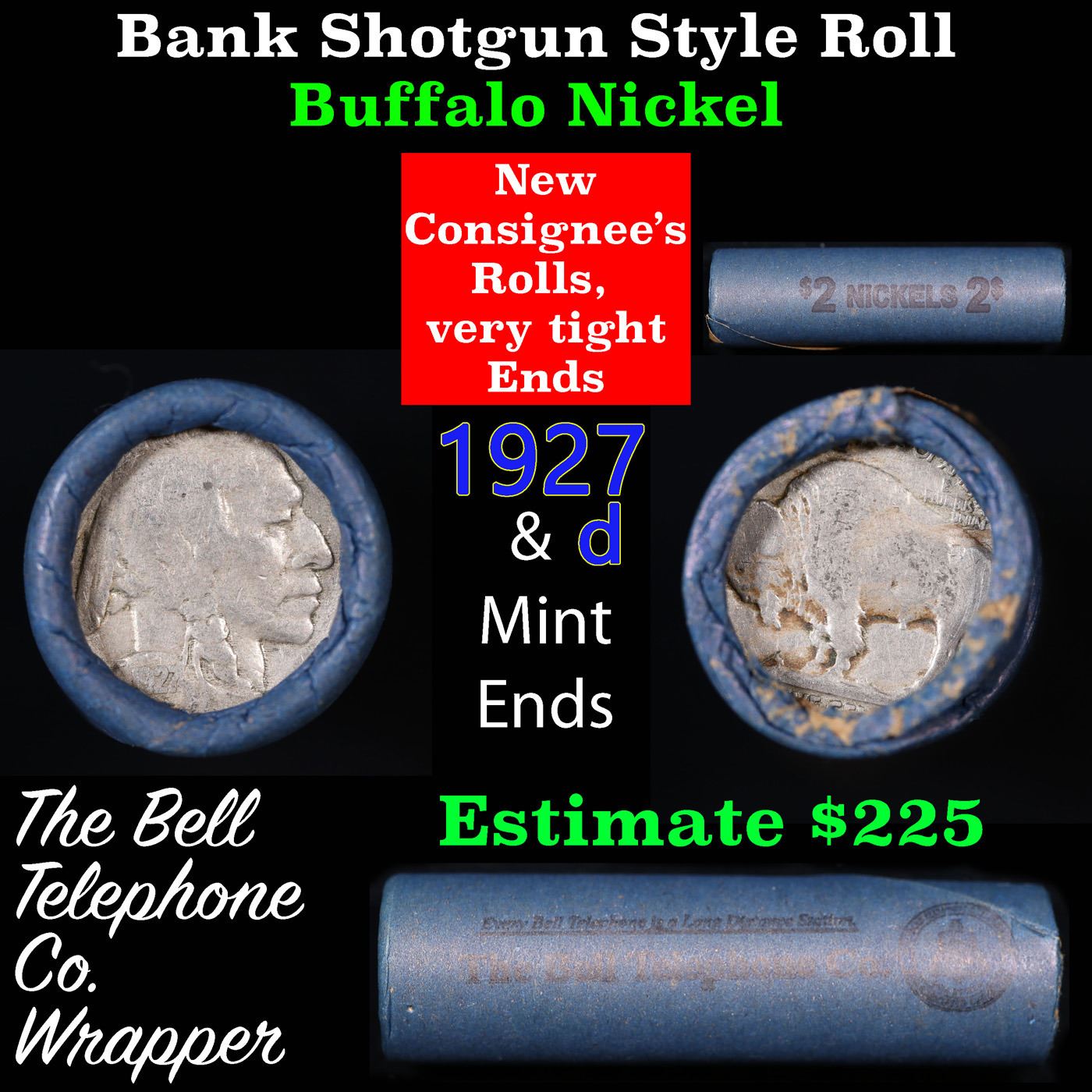Buffalo Nickel Shotgun Roll in Old Bank Style 'Bell Telephone' Wrapper 1927 & d Mint Ends. The roll is held in an old, rare "Bell Telephone Co." Bank style wrapper. This is the Bell Telephone logo from the 1960's. They are all from one Estate. The ends on these rolls are very tight. We will guarantee they are all full dates.