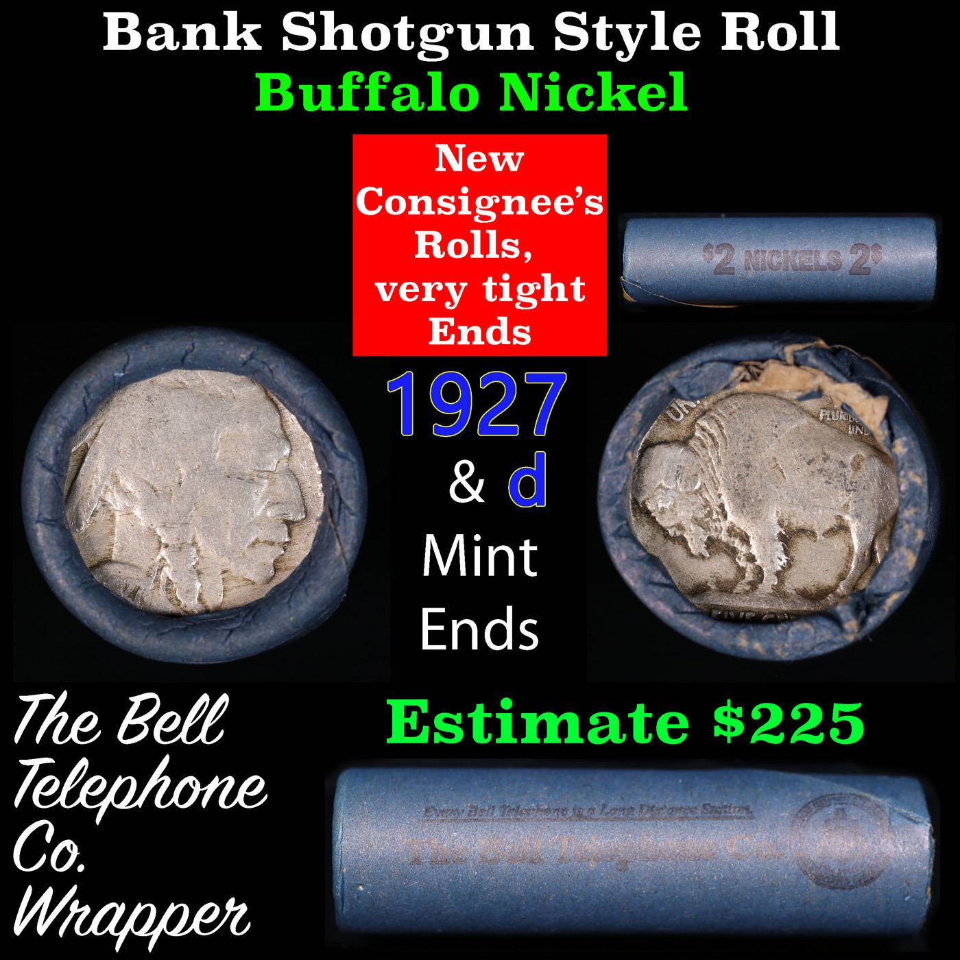 Buffalo Nickel Shotgun Roll in Old Bank Style 'Bell Telephone' Wrapper 1927 & d Mint Ends. The roll is held in an old, rare "Bell Telephone Co." Bank style wrapper. This is the Bell Telephone logo from the 1960's. They are all frrom one Estate. The ends on these rolls are very tight. We will guarantee they are all full dates.