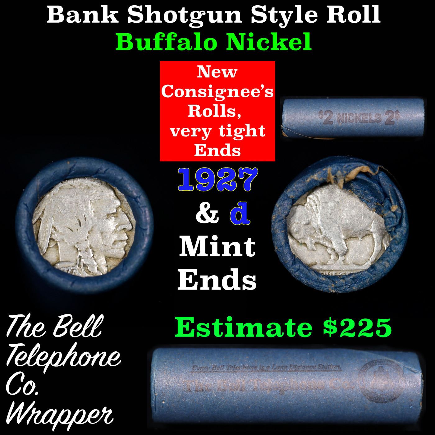 Buffalo Nickel Shotgun Roll in Old Bank Style 'Bell Telephone' Wrapper 1927 & d Mint Ends. The roll is held in an old, rare "Bell Telephone Co." Bank style wrapper. This is the Bell Telephone logo from the 1960's. They are all frrom one Estate. The ends on these rolls are very tight. We will guarantee they are all full dates.