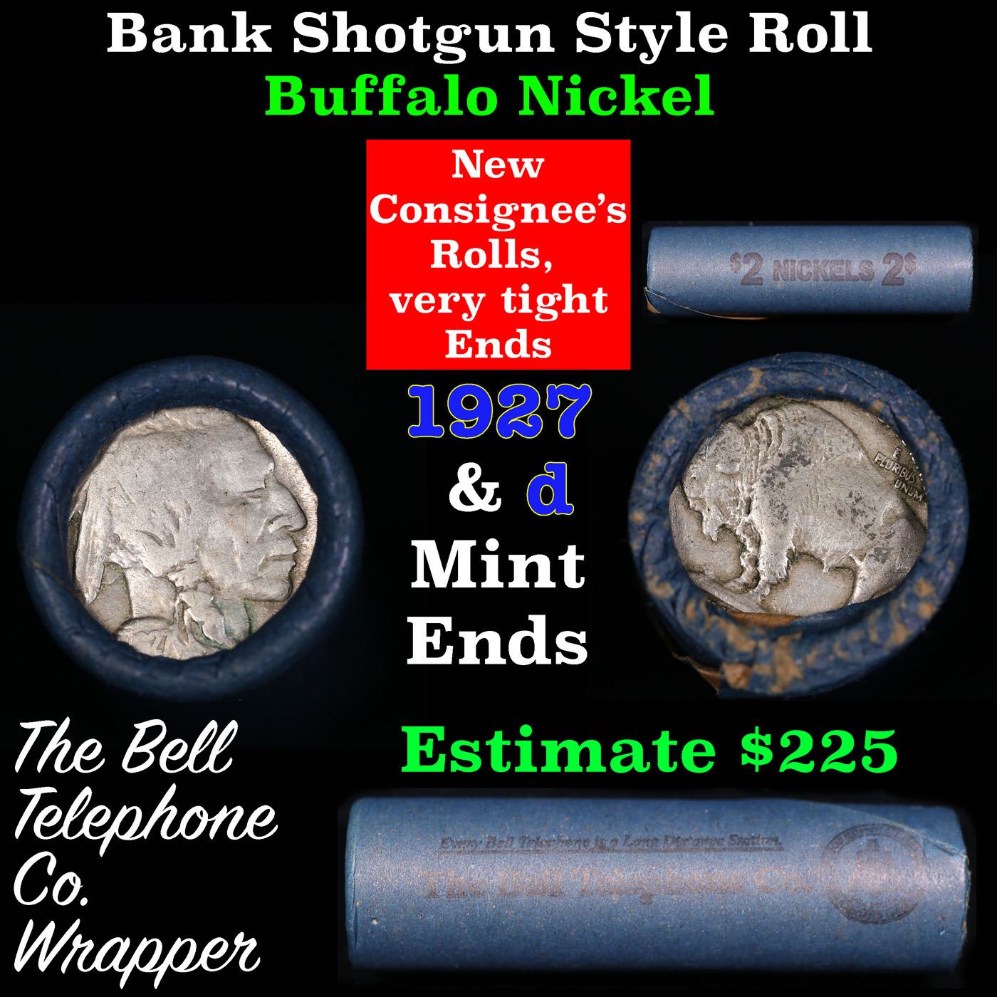 Buffalo Nickel Shotgun Roll in Old Bank Style 'Bell Telephone' Wrapper 1927 & d Mint Ends. The roll is held in an old, rare "Bell Telephone Co." Bank style wrapper. This is the Bell Telephone logo from the 1960's. They are all frrom one Estate. The ends on these rolls are very tight. We will guarantee they are all full dates.