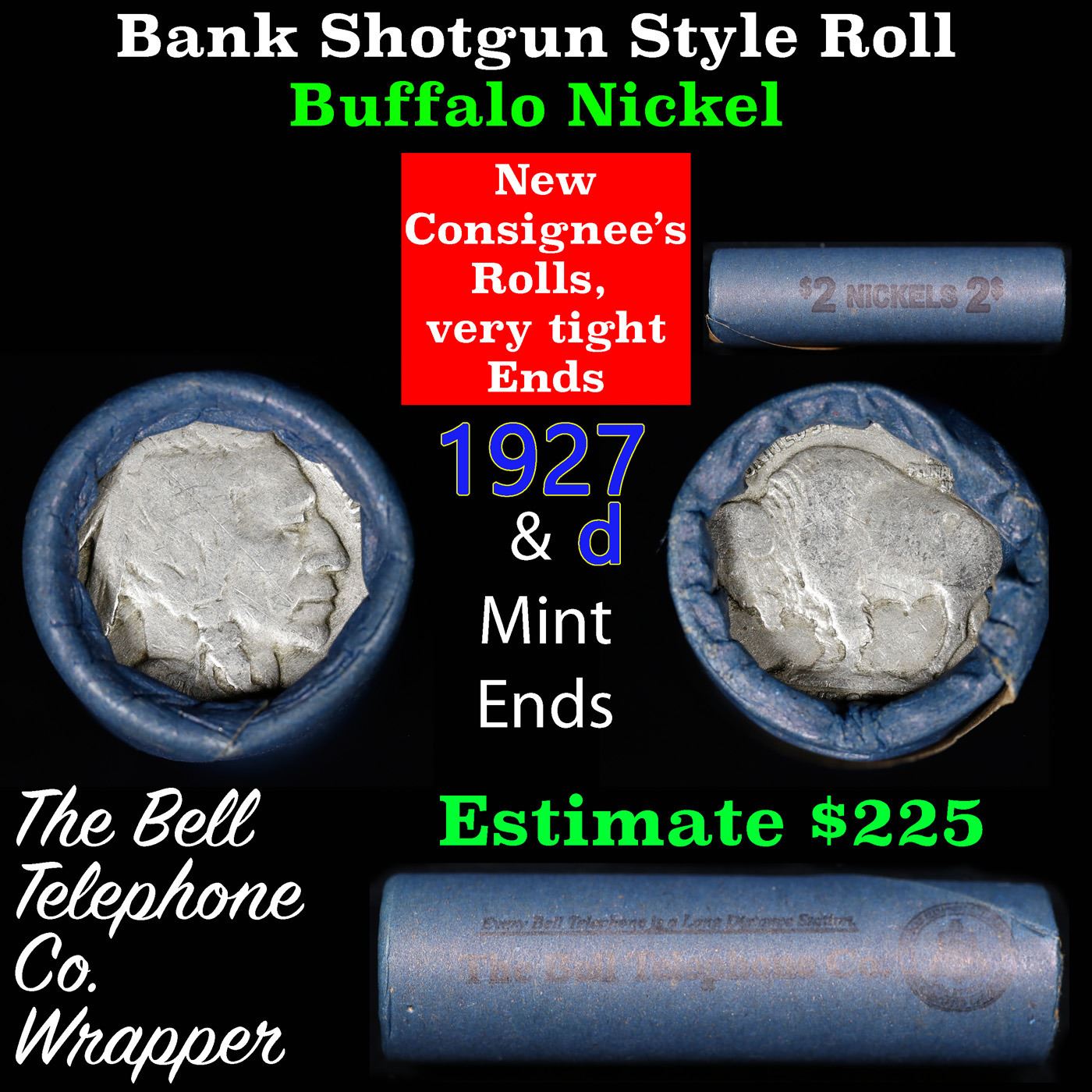 Buffalo Nickel Shotgun Roll in Old Bank Style 'Bell Telephone' Wrapper 1927 &d Mint Ends. The roll is held in an old, rare "Bell Telephone Co." Bank style wrapper. This is the Bell Telephone logo from the 1960's. They are all frrom one Estate. The ends on these rolls are very tight. We will guarantee they are all full dates.
