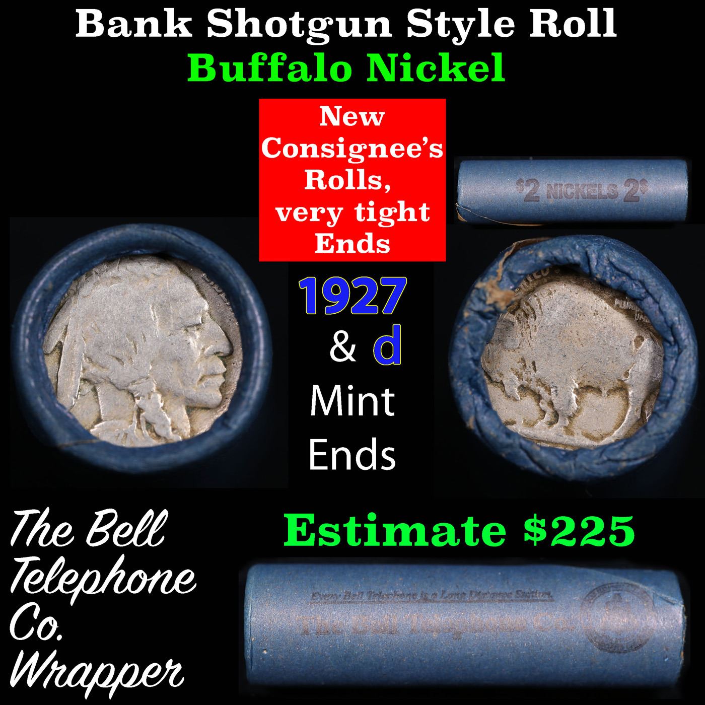 Buffalo Nickel Shotgun Roll in Old Bank Style 'Bell Telephone' Wrapper 1927 &d Mint Ends. The roll is held in an old, rare "Bell Telephone Co." Bank style wrapper. This is the Bell Telephone logo from the 1960's. They are all frrom one Estate. The ends on these rolls are very tight. We will guarantee they are all full dates.