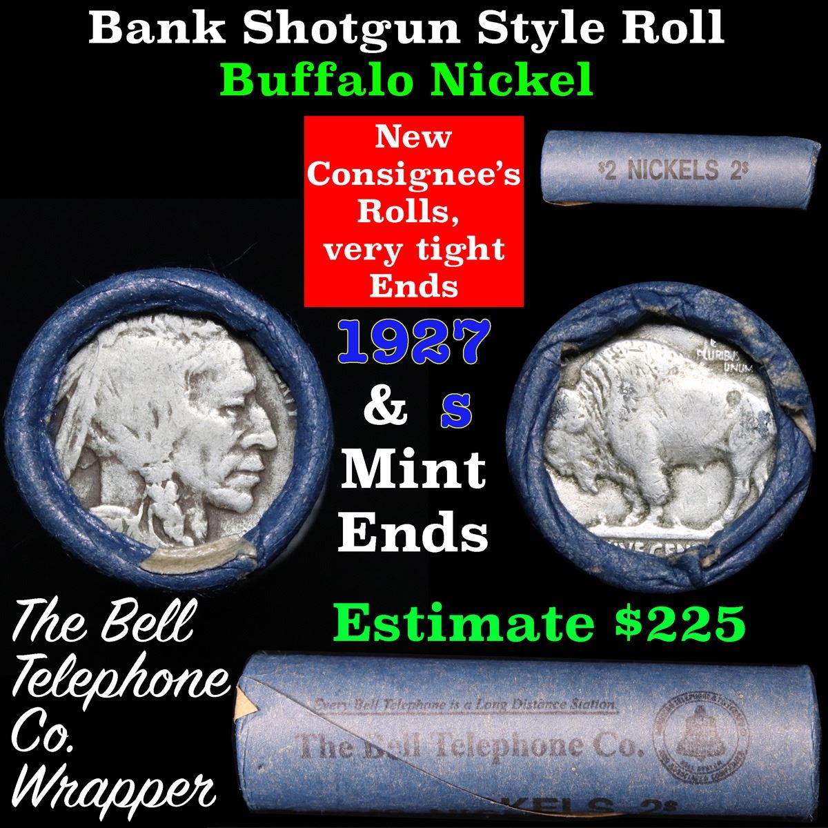 Buffalo Nickel Shotgun Roll in Old Bank Style 'Bell Telephone' Wrapper 1927 & s Mint Ends . .. The roll is held in an old, rare "Bell Telephone Co." Bank style wrapper. This is the Bell Telephone logo from the 1960's. They are all frrom one Estate. The ends on these rolls are very tight. We will guarantee they are all full dates.
