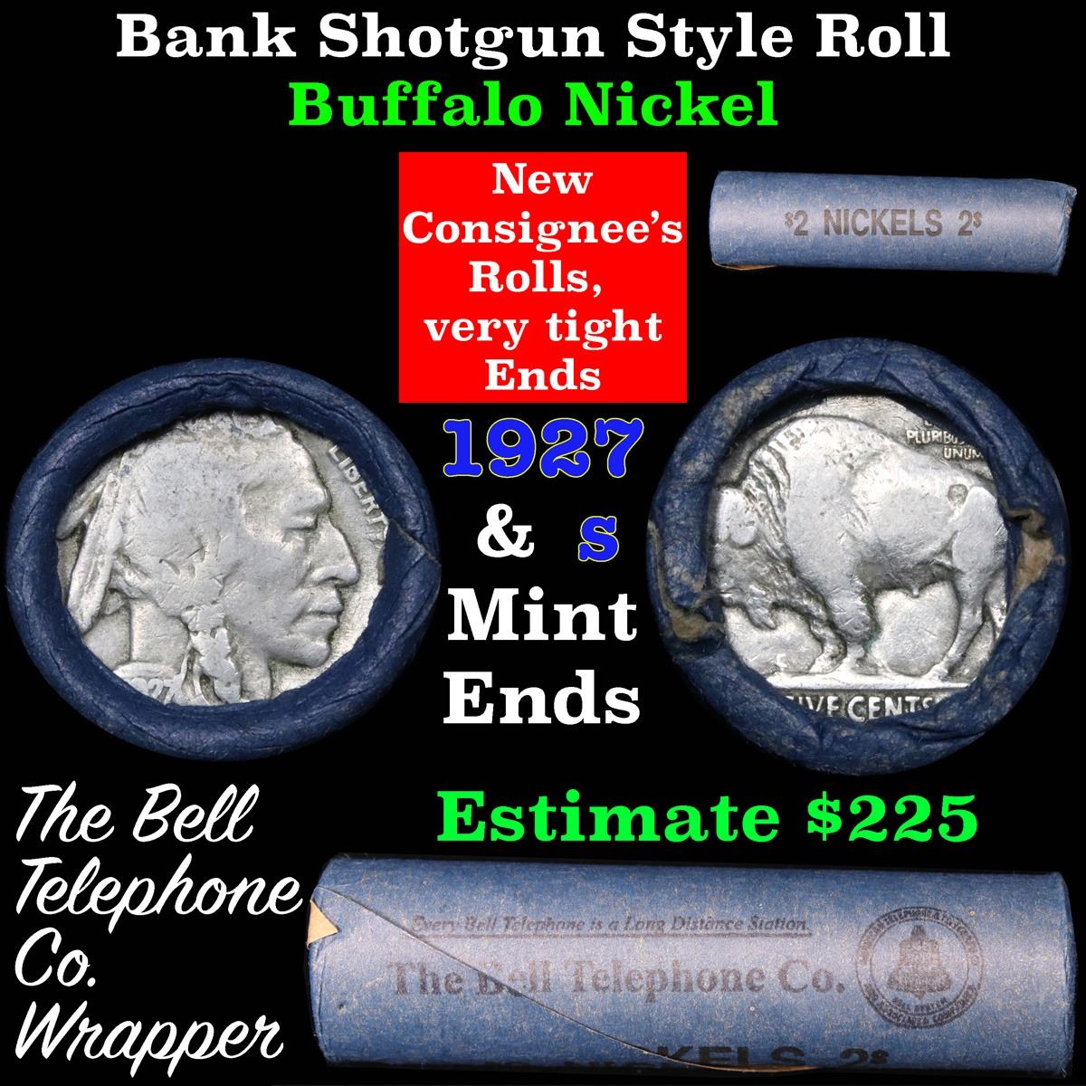 Buffalo Nickel Shotgun Roll in Old Bank Style 'Bell Telephone' Wrapper 1927 & s Mint Ends . .. The roll is held in an old, rare "Bell Telephone Co." Bank style wrapper. This is the Bell Telephone logo from the 1960's. They are all frrom one Estate. The ends on these rolls are very tight. We will guarantee they are all full dates.
