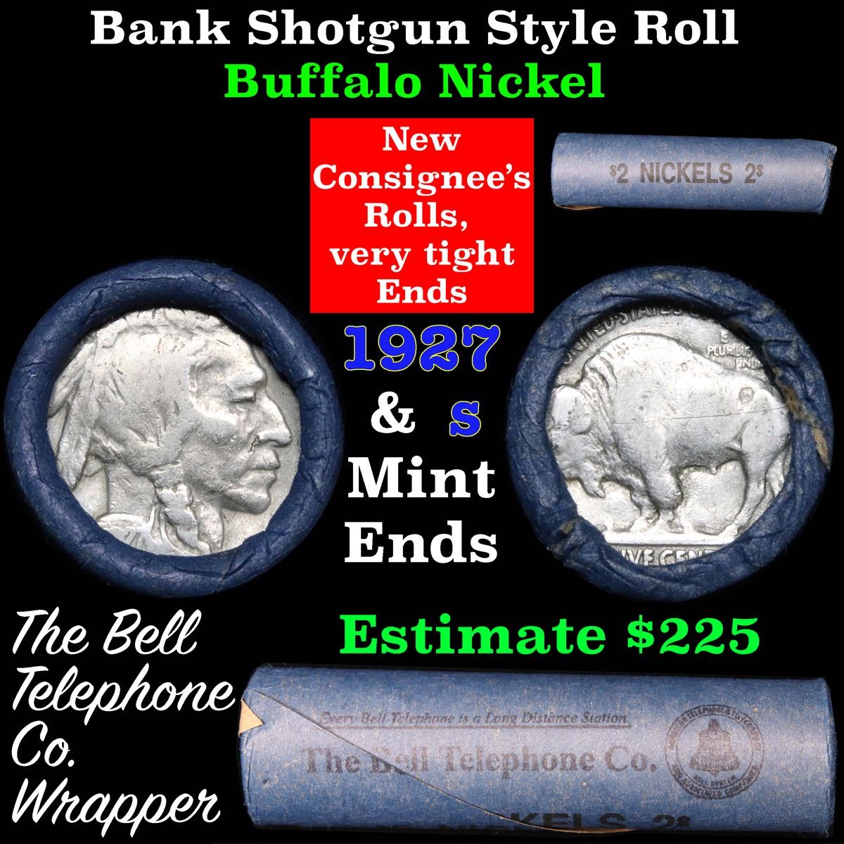Buffalo Nickel Shotgun Roll in Old Bank Style 'Bell Telephone' Wrapper 1927 & s Mint Ends . .. The roll is held in an old, rare "Bell Telephone Co." Bank style wrapper. This is the Bell Telephone logo from the 1960's. They are all frrom one Estate. The ends on these rolls are very tight. We will guarantee they are all full dates.
