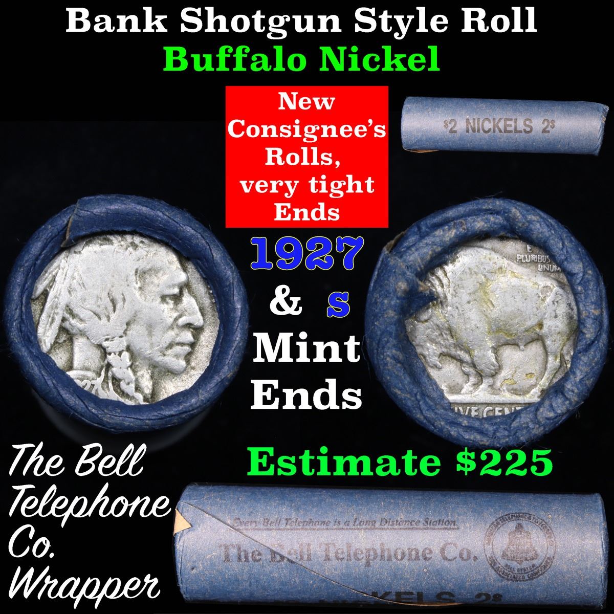 Buffalo Nickel Shotgun Roll in Old Bank Style 'Bell Telephone' Wrapper 1927 & s Mint Ends. The roll is held in an old, rare "Bell Telephone Co." Bank style wrapper. This is the Bell Telephone logo from the 1960's. They are all frrom one Estate. The ends on these rolls are very tight. We will guarantee they are all full dates.