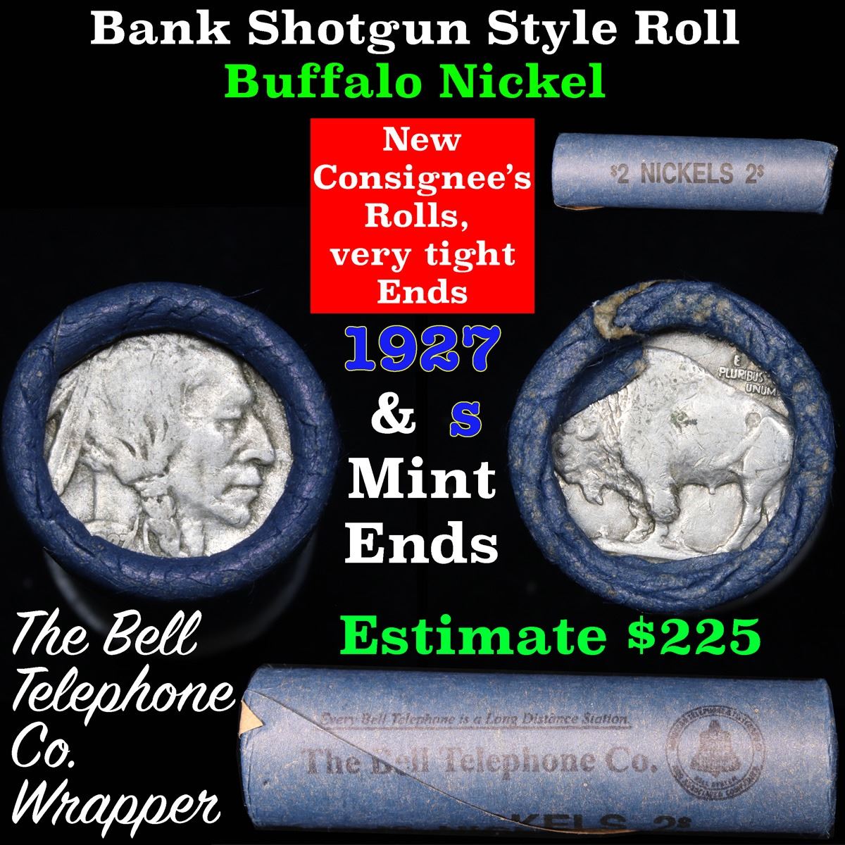 Buffalo Nickel Shotgun Roll in Old Bank Style 'Bell Telephone' Wrapper 1927 & s Mint Ends. The roll is held in an old, rare "Bell Telephone Co." Bank style wrapper. This is the Bell Telephone logo from the 1960's. They are all frrom one Estate. The ends on these rolls are very tight. We will guarantee they are all full dates.