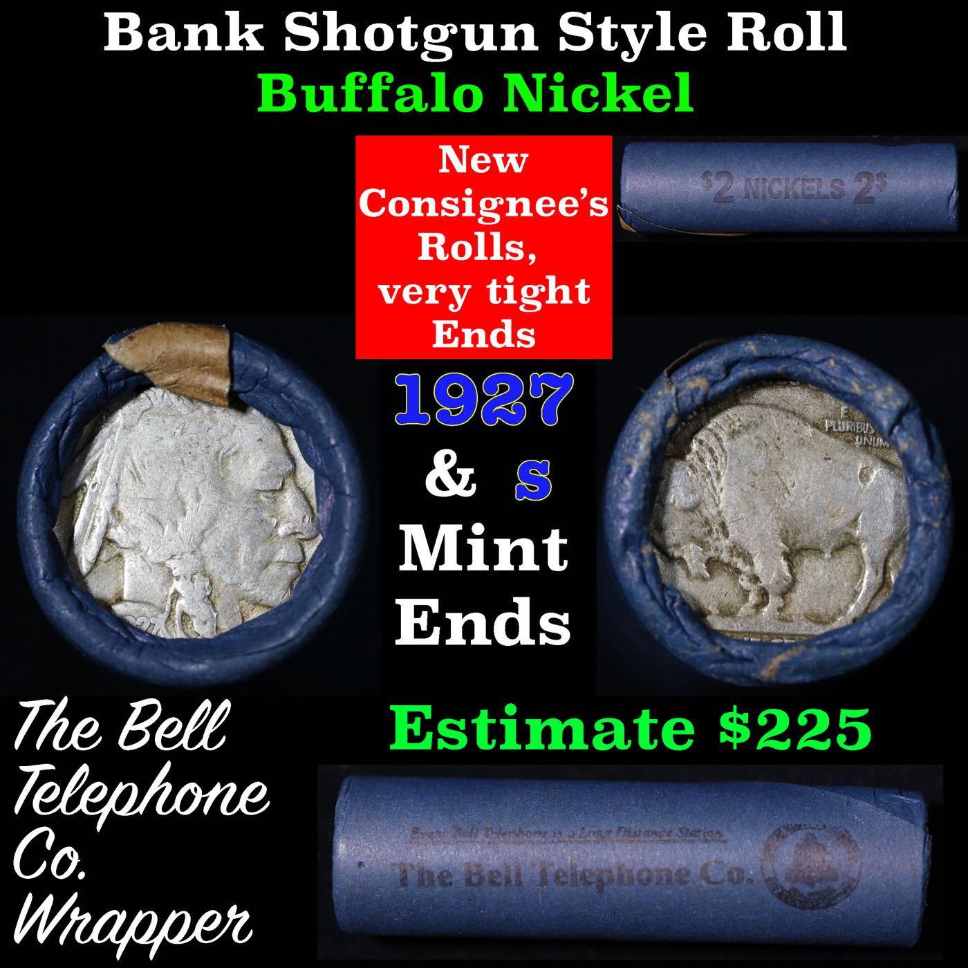 Buffalo Nickel Shotgun Roll in Old Bank Style 'Bell Telephone' Wrapper 1927 & s Mint Ends. The roll is held in an old, rare "Bell Telephone Co." Bank style wrapper. This is the Bell Telephone logo from the 1960's. They are all frrom one Estate. The ends on these rolls are very tight. We will guarantee they are all full dates.