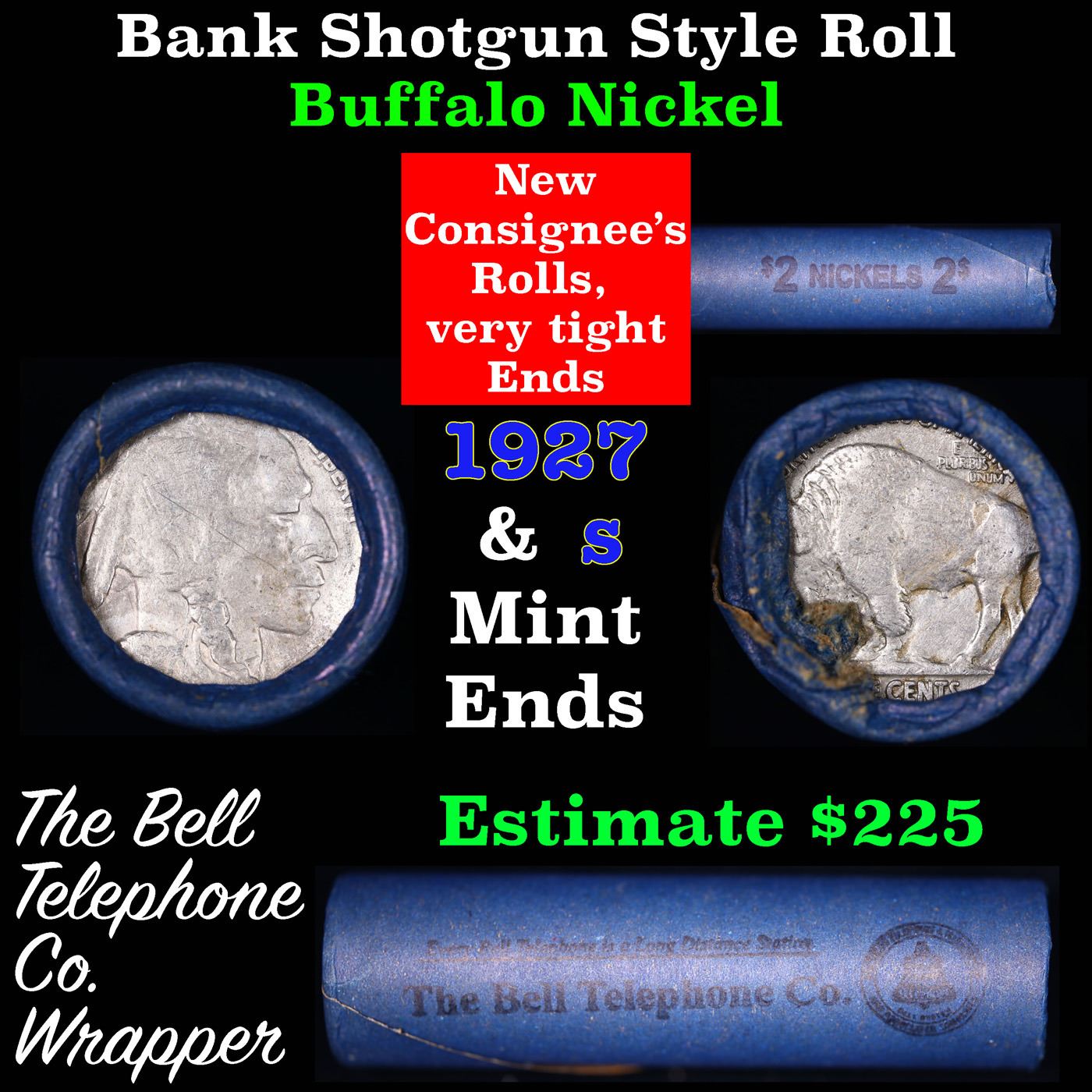Buffalo Nickel Shotgun Roll in Old Bank Style 'Bell Telephone' Wrapper 1927 &s Mint Ends. The roll is held in an old, rare "Bell Telephone Co." Bank style wrapper. This is the Bell Telephone logo from the 1960's. They are all frrom one Estate. The ends on these rolls are very tight. We will guarantee they are all full dates.